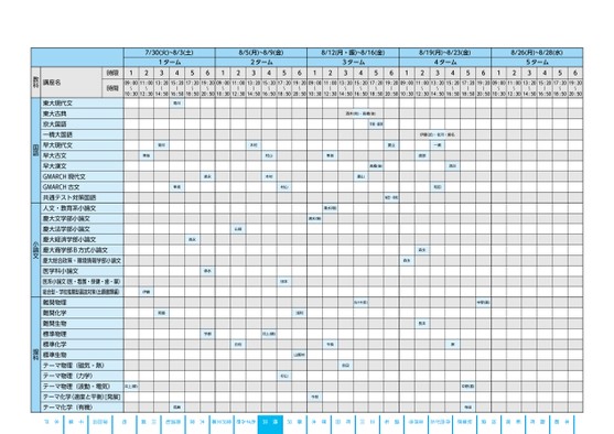 高3生・高卒生申込期限対面授業受講開始の4日前映像授業・オンライン授業8/22(木)この色のマスが授業のある時限です。●同一名称の講座は設置校舎・設置期間(ターム)・授業時間(時限)が異なっても同一内容です。●担当講師は変更になる場合がありますので、あらかじめご了承ください。7/30(火)~8/3(土)8/5(月)~8/9(金)8/12(月・振)~8/16(金)8/19(月)~8/23(金)8/26(月)~8/28(水)1ターム341256122ターム3456123ターム3456124ターム3456125ターム345609:0011:0013:2015:2017:2019:2009:0011:0013:2015:2017:2019:2009:0011:0013:2015:2017:2019:2009:0011:0013:2015:2017:2019:2009:0011:0013:2015:2017:2019:20〜〜〜〜〜〜〜〜〜〜〜〜〜〜〜〜〜〜〜〜〜〜〜〜〜〜〜〜〜〜10:3012:3014:5016:5018:5020:5010:3012:3014:5016:5018:5020:5010:3012:3014:5016:5018:5020:5010:3012:3014:5016:5018:5020:5010:3012:3014:5016:5018:5020:50菊川菊川隼坂森永隼坂木村村山木村村山酒井(完)・髙橋(佳)手塚・藤澤伊藤(武)・佐河・蝦名菱山一瀬隼坂渡部髙橋(佳)菱山税田・格和西川和田清水(瑞)清水(瑞)山田森永森永宇都井上(順)白石田本杉山浅利山野井今枝合田今枝伊藤岡島井上(順)岡島森永森永佐々木(哲)中野(喜)長井原中野(喜)寺田時限時間講座名教科東大現代文東大古典京大国語一橋大国語早大現代文早大古文早大漢文GMARCH現代文GMARCH古文共通テスト対策国語人文・教育系小論文慶大文学部小論文慶大法学部小論文慶大経済学部小論文慶大商学部B方式小論文慶大総合政策・環境情報学部小論文医学科小論文医系小論文(医・看護・保健・歯・薬)総合型・学校推薦型選抜対策(出願書類編)難関物理難関化学難関生物標準物理標準化学標準生物テーマ物理(磁気・熱)テーマ物理(力学)テーマ物理(波動・電気)テーマ化学(速度と平衡)[発展]テーマ化学(有機)国語小論文理科●2024年度/夏期講習/東日本/横浜/高3・卒生/パターン3560金沢文庫南浦和津田沼柏あざみ野2024_56_3_321_11_20240329103251.csv/3ページ自由が丘秋葉原吉祥寺厚木町田立川調布水戸千葉川越大宮横浜藤沢池袋校了時削除新宿麹町本郷