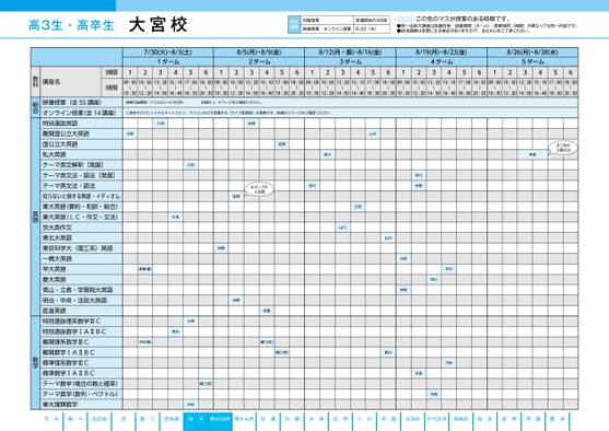 高3生・高卒生大宮校申込期限対面授業受講開始の4日前映像授業・オンライン授業8/22(木)この色のマスが授業のある時限です。●同一名称の講座は設置校舎・設置期間(ターム)・授業時間(時限)が異なっても同一内容です。●担当講師は変更になる場合がありますので、あらかじめご了承ください。7/30(火)~8/3(土)8/5(月)~8/9(金)8/12(月・振)~8/16(金)8/19(月)~8/23(金)8/26(月)~8/28(水)1ターム341256122ターム3456123ターム3456124ターム3456125ターム345609:0010:5013:2015:1017:0018:5009:0010:5013:2015:1017:0018:5009:0010:5013:2015:1017:0018:5009:0010:5013:2015:1017:0018:5009:0010:5013:2015:1017:0018:50〜〜〜〜〜〜〜〜〜〜〜〜〜〜〜〜〜〜〜〜〜〜〜〜〜〜〜〜〜〜10:3012:2014:5016:4018:3020:2010:3012:2014:5016:4018:3020:2010:3012:2014:5016:4018:3020:2010:3012:2014:5016:4018:3020:2010:3012:2014:5016:4018:3020:20視聴可能期間:7/23(火)〜9/30(月)詳細は3・4ページをご確認ください。ご自宅でタブレットやスマートフォン、パソコンなどで受講する「ライブ配信型」の授業です。詳細は5ページをご確認ください。久地金城川原山川岩間成川成川8/5~7の3日間金城早川仲野久恒山川仲野仲野佐藤口(哲)口(哲)山川國分川原仲野早川早川河本永島永島久地久地大澤尾台髙橋(慶)中村(隆)口(哲)渋谷講座名時限時間映像授業(全55講座)オンライン授業(全14講座)特別選抜英語難関国公立大英語国公立大英語私大英語テーマ英文解釈[発展]テーマ英文法・語法[発展]テーマ英文法・語法知らないと損する熟語・イディオム東大英語(要約・和訳・総合)東大英語(LC・作文・文法)京大英作文東北大英語東京科学大(理工系)英語一橋大英語早大英語慶大英語青山・立教・学習院大英語明治・中央・法政大英語医進英語特別選抜理系数学ⅢC特別選抜数学ⅠAⅡBC難関理系数学ⅢC難関数学ⅠAⅡBC標準理系数学ⅢC標準数学ⅠAⅡBCテーマ数学(場合の数と確率)テーマ数学(数列・ベクトル)東大理類数学教科総合英語数学8/28は3限のみ幸長麹町本郷池袋校了時削除新宿●2024年度/夏期講習/東日本/大宮/高3・卒生/パターン3560金沢文庫南浦和津田沼柏あざみ野2024_56_3_324_11_20240329103251.csv/1ページ自由が丘秋葉原吉祥寺厚木町田立川調布水戸千葉川越大宮横浜藤沢
