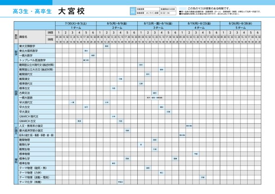 高3生・高卒生大宮校申込期限対面授業受講開始の4日前映像授業・オンライン授業8/22(木)この色のマスが授業のある時限です。●同一名称の講座は設置校舎・設置期間(ターム)・授業時間(時限)が異なっても同一内容です。●担当講師は変更になる場合がありますので、あらかじめご了承ください。7/30(火)~8/3(土)8/5(月)~8/9(金)8/12(月・振)~8/16(金)8/19(月)~8/23(金)8/26(月)~8/28(水)1ターム341256122ターム3456123ターム3456124ターム3456125ターム345609:0010:5013:2015:1017:0018:5009:0010:5013:2015:1017:0018:5009:0010:5013:2015:1017:0018:5009:0010:5013:2015:1017:0018:5009:0010:5013:2015:1017:0018:50〜〜〜〜〜〜〜〜〜〜〜〜〜〜〜〜〜〜10:3012:2014:5016:4018:3020:2010:3012:2014:5016:4018:3020:2010:3012:2014:5016:4018:3020:2010:3012:2014:5016:4018:3020:2010:3012:2014:5016:4018:3020:20〜〜〜〜〜〜〜〜〜〜〜〜飯田尾台口(哲)秦野一瀬小林佐河黒須鈴木白旗脇坂鈴木福田鈴木・脇坂・高橋(健)福田打越金渡部三浦渡部堀江清水(瑞)清水(瑞)宇都國兼宇都打越今西小林今西倉田宇野沢松崎岡島講座名時限時間東大文類数学東北大理系数学一橋大数学トップレベル医進数学難関国公立大現代文(論述対策)難関国公立大古文(論述対策)難関現代文難関漢文標準現代文標準古文古典文法一橋大国語早大現代文早大古文早大漢文GMARCH現代文GMARCH古文人文・教育系小論文慶大経済学部小論文医系小論文(医・看護・保健・歯・薬)難関物理難関化学難関生物標準物理標準化学標準生物テーマ物理(磁気・熱)テーマ物理(力学)テーマ物理(波動・電気)テーマ化学(有機)教科数学国語小論文理科●2024年度/夏期講習/東日本/大宮/高3・卒生/パターン35602024_56_3_324_11_20240329103251.csv/2ページ校了時削除