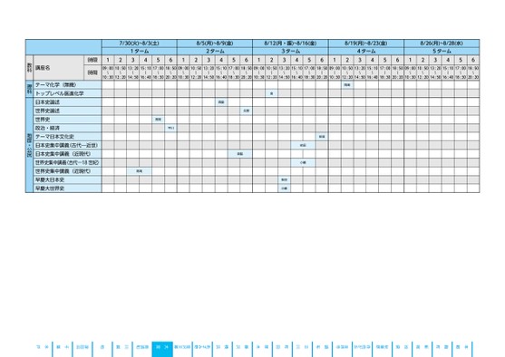 高3生・高卒生申込期限対面授業受講開始の4日前映像授業・オンライン授業8/22(木)この色のマスが授業のある時限です。●同一名称の講座は設置校舎・設置期間(ターム)・授業時間(時限)が異なっても同一内容です。●担当講師は変更になる場合がありますので、あらかじめご了承ください。7/30(火)~8/3(土)8/5(月)~8/9(金)8/12(月・振)~8/16(金)8/19(月)~8/23(金)8/26(月)~8/28(水)1ターム341256122ターム3456123ターム3456124ターム3456125ターム345609:0010:5013:2015:1017:0018:5009:0010:5013:2015:1017:0018:5009:0010:5013:2015:1017:0018:5009:0010:5013:2015:1017:0018:5009:0010:5013:2015:1017:0018:50〜〜〜〜〜〜〜〜〜〜〜〜〜〜〜〜〜〜〜〜〜〜〜〜〜〜〜〜〜〜10:3012:2014:5016:4018:3020:2010:3012:2014:5016:4018:3020:2010:3012:2014:5016:4018:3020:2010:3012:2014:5016:4018:3020:2010:3012:2014:5016:4018:3020:20髙岡平川髙岡岡島金森脇矢野森脇依田依田小嶋依田小嶋講座名時限時間テーマ化学(無機)トップレベル医進化学日本史論述世界史論述世界史政治・経済テーマ日本文化史日本史集中講義(古代―近世)日本史集中講義(近現代)世界史集中講義(古代―18世紀)世界史集中講義(近現代)早慶大日本史早慶大世界史教科理科地歴・公民●2024年度/夏期講習/東日本/大宮/高3・卒生/パターン3560金沢文庫南浦和津田沼柏あざみ野2024_56_3_324_11_20240329103251.csv/3ページ自由が丘秋葉原吉祥寺厚木町田立川調布水戸千葉川越大宮横浜藤沢池袋校了時削除新宿麹町本郷