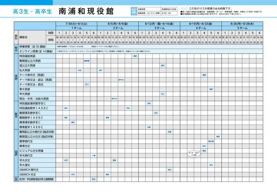 高3生・高卒生南浦和現役館申込期限対面授業受講開始の4日前映像授業・オンライン授業8/22(木)この色のマスが授業のある時限です。●同一名称の講座は設置校舎・設置期間(ターム)・授業時間(時限)が異なっても同一内容です。●担当講師は変更になる場合がありますので、あらかじめご了承ください。7/30(火)~8/3(土)8/5(月)~8/9(金)8/12(月・振)~8/16(金)8/19(月)~8/23(金)8/26(月)~8/28(水)1ターム341256122ターム3456123ターム3456124ターム3456125ターム345609:0010:5013:2015:1017:0018:5009:0010:5013:2015:1017:0018:5009:0010:5013:2015:1017:0018:5009:0010:5013:2015:1017:0018:5009:0010:5013:2015:1017:0018:50〜〜〜〜〜〜〜〜〜〜〜〜〜〜〜〜〜〜10:3012:2014:5016:4018:3020:2010:3012:2014:5016:4018:3020:2010:3012:2014:5016:4018:3020:2010:3012:2014:5016:4018:3020:2010:3012:2014:5016:4018:3020:20〜〜〜〜〜〜〜〜〜〜〜〜視聴可能期間:7/23(火)〜9/30(月)詳細は3・4ページをご確認ください。ご自宅でタブレットやスマートフォン、パソコンなどで受講する「ライブ配信型」の授業です。詳細は5ページをご確認ください。篠原髙橋(慶)秋谷成川石川田中(久)田中(久)河本秦野護守村上刈谷刈谷永島一瀬飛田福田福田相川瀬谷瀬谷佐河佐河飯島飯島荒田鈴木田中脇坂8/19・20の2日間脇坂清水(直)田中講座名時限時間映像授業(全55講座)オンライン授業(全14講座)特別選抜英語難関国公立大英語国公立大英語私大英語テーマ英作文[発展]テーマ英文法・語法[発展]テーマ英文法・語法東大英語早大英語明治・中央・法政大英語特別選抜理系数学ⅢC特別選抜数学ⅠAⅡBC難関理系数学ⅢC難関数学ⅠAⅡBC標準理系数学ⅢC標準数学ⅠAⅡBC難関国公立大現代文(論述対策)難関国公立大古文(論述対策)標準現代文標準古文ビジュアル古文常識早大現代文早大古文早大漢文GMARCH現代文GMARCH古文総合型・学校推薦型選抜対策(出願書類編)教科総合英語数学国語小論文●2024年度/夏期講習/東日本/南浦和/高3・卒生/パターン35602024_56_3_336_11_20240329103251.csv/1ページ校了時削除