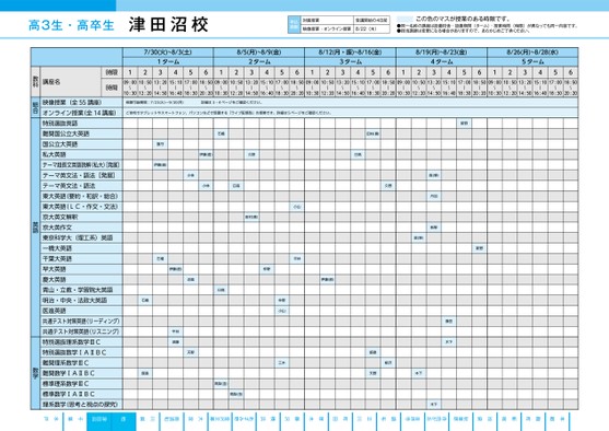 高3生・高卒生津田沼校申込期限対面授業受講開始の4日前映像授業・オンライン授業8/22(木)この色のマスが授業のある時限です。●同一名称の講座は設置校舎・設置期間(ターム)・授業時間(時限)が異なっても同一内容です。●担当講師は変更になる場合がありますので、あらかじめご了承ください。7/30(火)~8/3(土)8/5(月)~8/9(金)8/12(月・振)~8/16(金)8/19(月)~8/23(金)8/26(月)~8/28(水)1ターム341256122ターム3456123ターム3456124ターム3456125ターム345609:0010:5013:2015:1017:0018:5009:0010:5013:2015:1017:0018:5009:0010:5013:2015:1017:0018:5009:0010:5013:2015:1017:0018:5009:0010:5013:2015:1017:0018:50〜〜〜〜〜〜〜〜〜〜〜〜〜〜〜〜〜〜〜〜〜〜〜〜〜〜〜〜〜〜10:3012:2014:5016:4018:3020:2010:3012:2014:5016:4018:3020:2010:3012:2014:5016:4018:3020:2010:3012:2014:5016:4018:3020:2010:3012:2014:5016:4018:3020:20講座名時限時間映像授業(全55講座)オンライン授業(全14講座)特別選抜英語難関国公立大英語国公立大英語私大英語テーマ超長文英語読解(私大)発展]テーマ英文法・語法[発展]テーマ英文法・語法東大英語(要約・和訳・総合)東大英語(LC・作文・文法)京大英文解釈京大英作文東京科学大(理工系)英語一橋大英語千葉大英語早大英語慶大英語青山・立教・学習院大英語明治・中央・法政大英語医進英語共通テスト対策英語(リーディング)共通テスト対策英語(リスニング)特別選抜理系数学ⅢC特別選抜数学ⅠAⅡBC難関理系数学ⅢC難関数学ⅠAⅡBC標準理系数学ⅢC標準数学ⅠAⅡBC理系数学(思考と視点の探究)教科総合英語数学視聴可能期間:7/23(火)〜9/30(月)詳細は3・4ページをご確認ください。ご自宅でタブレットやスマートフォン、パソコンなどで受講する「ライブ配信型」の授業です。詳細は5ページをご確認ください。石橋田村(喜)伊藤(直)久野日髙護守伊藤(直)小林小林日髙久野田村(喜)小山平林仲野伊藤(直)仲野小山三木石橋伊藤(直)近嵐日髙石橋飯島平林須藤天野高梨(由)高梨(由)新野森(博)丹羽新野森(博)新野飯島天野柳沢藤田木下木下木下●2024年度/夏期講習/東日本/津田沼/高3・卒生/パターン3560金沢文庫南浦和津田沼柏あざみ野2024_56_3_327_11_20240329103251.csv/1ページ自由が丘秋葉原吉祥寺厚木町田立川調布水戸千葉横浜藤沢川越大宮池袋校了時削除新宿麹町本郷