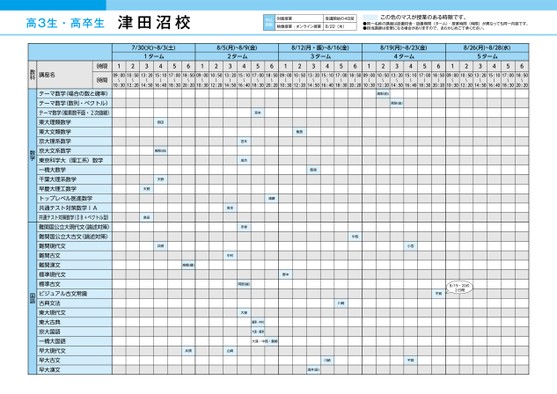 高3生・高卒生津田沼校申込期限対面授業受講開始の4日前映像授業・オンライン授業8/22(木)この色のマスが授業のある時限です。●同一名称の講座は設置校舎・設置期間(ターム)・授業時間(時限)が異なっても同一内容です。●担当講師は変更になる場合がありますので、あらかじめご了承ください。7/30(火)~8/3(土)8/5(月)~8/9(金)8/12(月・振)~8/16(金)8/19(月)~8/23(金)8/26(月)~8/28(水)1ターム341256122ターム3456123ターム3456124ターム3456125ターム345609:0010:5013:2015:1017:0018:5009:0010:5013:2015:1017:0018:5009:0010:5013:2015:1017:0018:5009:0010:5013:2015:1017:0018:5009:0010:5013:2015:1017:0018:50〜〜〜〜〜〜〜〜〜〜〜〜〜〜〜〜〜〜10:3012:2014:5016:4018:3020:2010:3012:2014:5016:4018:3020:2010:3012:2014:5016:4018:3020:2010:3012:2014:5016:4018:3020:2010:3012:2014:5016:4018:3020:20〜〜〜〜〜〜〜〜〜〜〜〜高梨(由)高梨(由)岡田高梨(由)天野兵頭天野島田高橋(健)飯島飯島宮本宮本成合手塚阿部(誠)大窪宮本中村遠藤野中中西川崎藤澤・中村大窪・藤澤大窪・中西・豊崎兵頭山崎川崎酒井(辰)8/19・20の2日間平賀小宮平賀時限時間講座名教科テーマ数学(場合の数と確率)テーマ数学(数列・ベクトル)テーマ数学(複素数平面・2次曲線)東大理類数学東大文類数学京大理系数学京大文系数学東京科学大(理工系)数学一橋大数学千葉大理系数学早慶大理工数学トップレベル医進数学共通テスト対策数学IA共通テスト対策数学(ⅡB+ベクトル型)難関国公立大現代文(論述対策)難関国公立大古文(論述対策)難関現代文難関古文難関漢文標準現代文標準古文ビジュアル古文常識古典文法東大現代文東大古典京大国語一橋大国語早大現代文早大古文早大漢文数学国語●2024年度/夏期講習/東日本/津田沼/高3・卒生/パターン35602024_56_3_327_11_20240329103251.csv/2ページ校了時削除