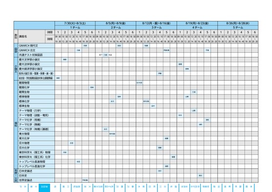 高3生・高卒生申込期限対面授業受講開始の4日前映像授業・オンライン授業8/22(木)この色のマスが授業のある時限です。●同一名称の講座は設置校舎・設置期間(ターム)・授業時間(時限)が異なっても同一内容です。●担当講師は変更になる場合がありますので、あらかじめご了承ください。7/30(火)~8/3(土)8/5(月)~8/9(金)8/12(月・振)~8/16(金)8/19(月)~8/23(金)8/26(月)~8/28(水)1ターム341256122ターム3456123ターム3456124ターム3456125ターム345609:0010:5013:2015:1017:0018:5009:0010:5013:2015:1017:0018:5009:0010:5013:2015:1017:0018:5009:0010:5013:2015:1017:0018:5009:0010:5013:2015:1017:0018:50〜〜〜〜〜〜〜〜〜〜〜〜〜〜〜〜〜〜〜〜〜〜〜〜〜〜〜〜〜〜10:3012:2014:5016:4018:3020:2010:3012:2014:5016:4018:3020:2010:3012:2014:5016:4018:3020:2010:3012:2014:5016:4018:3020:2010:3012:2014:5016:4018:3020:20兵頭川崎森下・川崎・光田光田松藤阿部(順)平賀陣野陣野伊藤佐々木(哲)西尾宮原古川鈴木(翔)田中倉橋倉橋山縣三浦山縣村木古川鈴木(誠)合田合田合田平尾(雅)浅利浅利黒川樹葉樹葉清野田中樹葉講座名時限時間GMARCH現代文GMARCH古文共通テスト対策国語慶大文学部小論文慶大法学部小論文慶大経済学部小論文医系小論文(医・看護・保健・歯・薬)総合型・学校推薦型選抜対策(出願書類編)難関物理難関化学難関生物標準物理標準化学標準生物テーマ物理(力学)テーマ物理(波動・電気)テーマ化学(有機)テーマ化学(無機)テーマ化学(有機)基礎]東大物理東大化学京大物理京大化学東京科学大(理工系)物理東京科学大(理工系)化学トップレベル医進物理トップレベル医進化学日本史論述日本史世界史論述教科国語小論文理科地歴・公民●2024年度/夏期講習/東日本/津田沼/高3・卒生/パターン3560金沢文庫南浦和津田沼柏あざみ野2024_56_3_327_11_20240329103251.csv/3ページ自由が丘秋葉原吉祥寺厚木町田立川調布水戸千葉横浜藤沢川越大宮池袋校了時削除新宿麹町本郷