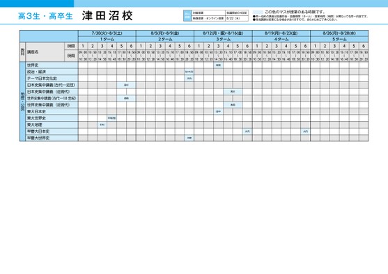 高3生・高卒生津田沼校申込期限対面授業受講開始の4日前映像授業・オンライン授業8/22(木)この色のマスが授業のある時限です。●同一名称の講座は設置校舎・設置期間(ターム)・授業時間(時限)が異なっても同一内容です。●担当講師は変更になる場合がありますので、あらかじめご了承ください。7/30(火)~8/3(土)8/5(月)~8/9(金)8/12(月・振)~8/16(金)8/19(月)~8/23(金)8/26(月)~8/28(水)1ターム341256122ターム3456123ターム3456124ターム3456125ターム345609:0010:5013:2015:1017:0018:5009:0010:5013:2015:1017:0018:5009:0010:5013:2015:1017:0018:5009:0010:5013:2015:1017:0018:5009:0010:5013:2015:1017:0018:50〜〜〜〜〜〜〜〜〜〜〜〜〜〜〜〜〜〜10:3012:2014:5016:4018:3020:2010:3012:2014:5016:4018:3020:2010:3012:2014:5016:4018:3020:2010:3012:2014:5016:4018:3020:2010:3012:2014:5016:4018:3020:20〜〜〜〜〜〜〜〜〜〜〜〜高杉島崎平尾(雅)中村髙岡田中高杉髙岡佐々木(洋)大内大野大内大内時限時間講座名教科世界史政治・経済テーマ日本文化史日本史集中講義(古代―近世)日本史集中講義(近現代)世界史集中講義(古代―18世紀)世界史集中講義(近現代)東大日本史東大世界史東大地理早慶大日本史早慶大世界史地歴・公民●2024年度/夏期講習/東日本/津田沼/高3・卒生/パターン35602024_56_3_327_11_20240329103251.csv/4ページ校了時削除