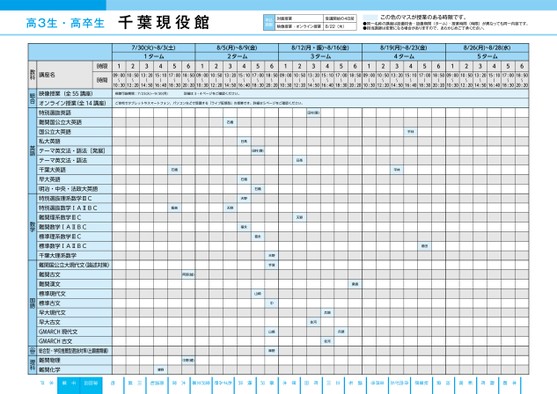 高3生・高卒生千葉現役館申込期限対面授業受講開始の4日前映像授業・オンライン授業8/22(木)この色のマスが授業のある時限です。●同一名称の講座は設置校舎・設置期間(ターム)・授業時間(時限)が異なっても同一内容です。●担当講師は変更になる場合がありますので、あらかじめご了承ください。7/30(火)~8/3(土)8/5(月)~8/9(金)8/12(月・振)~8/16(金)8/19(月)~8/23(金)8/26(月)~8/28(水)1ターム341256122ターム3456123ターム3456124ターム3456125ターム345609:0010:5013:2015:1017:0018:5009:0010:5013:2015:1017:0018:5009:0010:5013:2015:1017:0018:5009:0010:5013:2015:1017:0018:5009:0010:5013:2015:1017:0018:50〜〜〜〜〜〜〜〜〜〜〜〜〜〜〜〜〜〜〜〜〜〜〜〜〜〜〜〜〜〜10:3012:2014:5016:4018:3020:2010:3012:2014:5016:4018:3020:2010:3012:2014:5016:4018:3020:2010:3012:2014:5016:4018:3020:2010:3012:2014:5016:4018:3020:20視聴可能期間:7/23(火)〜9/30(月)詳細は3・4ページをご確認ください。ご自宅でタブレットやスマートフォン、パソコンなどで受講する「ライブ配信型」の授業です。詳細は5ページをご確認ください。平林平林島田石橋天野日髙石橋天野福永田村(喜)石橋福永山崎天野手塚中山崎陣野田村(喜)日髙天野桑島佐河兵頭佐河兵頭石橋飯島阿部(誠)中野(健)清野講座名時限時間映像授業(全55講座)オンライン授業(全14講座)特別選抜英語難関国公立大英語国公立大英語私大英語テーマ英文法・語法[発展]テーマ英文法・語法千葉大英語早大英語明治・中央・法政大英語特別選抜理系数学ⅢC特別選抜数学ⅠAⅡBC難関理系数学ⅢC難関数学ⅠAⅡBC標準理系数学ⅢC標準数学ⅠAⅡBC千葉大理系数学難関国公立大現代文(論述対策)難関古文難関漢文標準現代文標準古文早大現代文早大古文GMARCH現代文GMARCH古文総合型・学校推薦型選抜対策(出願書類編)難関物理難関化学教科総合英語数学国語小論文理科●2024年度/夏期講習/東日本/千葉/高3・卒生/パターン3560金沢文庫南浦和津田沼柏あざみ野2024_56_3_334_11_20240329103251.csv/1ページ自由が丘秋葉原吉祥寺厚木町田立川調布水戸千葉川越大宮横浜藤沢池袋校了時削除新宿麹町本郷