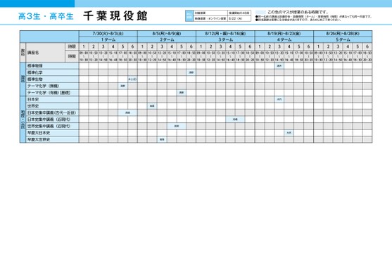高3生・高卒生千葉現役館申込期限対面授業受講開始の4日前映像授業・オンライン授業8/22(木)この色のマスが授業のある時限です。●同一名称の講座は設置校舎・設置期間(ターム)・授業時間(時限)が異なっても同一内容です。●担当講師は変更になる場合がありますので、あらかじめご了承ください。7/30(火)~8/3(土)8/5(月)~8/9(金)8/12(月・振)~8/16(金)8/19(月)~8/23(金)8/26(月)~8/28(水)1ターム341256122ターム3456123ターム3456124ターム3456125ターム345609:0010:5013:2015:1017:0018:5009:0010:5013:2015:1017:0018:5009:0010:5013:2015:1017:0018:5009:0010:5013:2015:1017:0018:5009:0010:5013:2015:1017:0018:50〜〜〜〜〜〜〜〜〜〜〜〜〜〜〜〜〜〜10:3012:2014:5016:4018:3020:2010:3012:2014:5016:4018:3020:2010:3012:2014:5016:4018:3020:2010:3012:2014:5016:4018:3020:2010:3012:2014:5016:4018:3020:20〜〜〜〜〜〜〜〜〜〜〜〜清野清野井上(正)清野髙岡髙橋髙橋髙岡髙岡酒井大内大内講座名時限時間標準物理標準化学標準生物テーマ化学(無機)テーマ化学(有機)基礎]日本史世界史日本史集中講義(古代―近世)日本史集中講義(近現代)世界史集中講義(近現代)早慶大日本史早慶大世界史教科理科地歴・公民●2024年度/夏期講習/東日本/千葉/高3・卒生/パターン35602024_56_3_334_11_20240329103251.csv/2ページ校了時削除