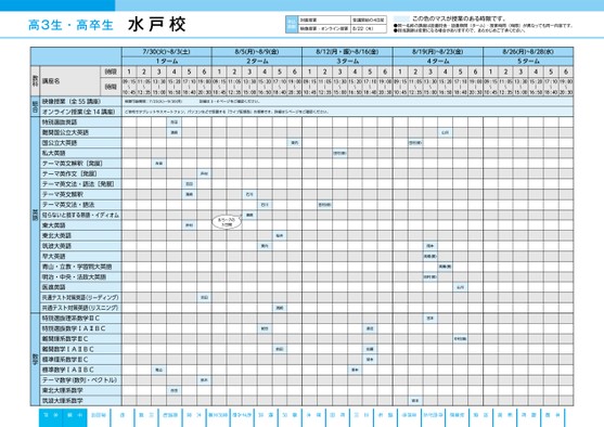 高3生・高卒生水戸校申込期限対面授業受講開始の4日前映像授業・オンライン授業8/22(木)この色のマスが授業のある時限です。●同一名称の講座は設置校舎・設置期間(ターム)・授業時間(時限)が異なっても同一内容です。●担当講師は変更になる場合がありますので、あらかじめご了承ください。7/30(火)~8/3(土)8/5(月)~8/9(金)8/12(月・振)~8/16(金)8/19(月)~8/23(金)8/26(月)~8/28(水)1ターム341256122ターム3456123ターム3456124ターム3456125ターム345609:1511:0513:3015:2017:1019:0009:1511:0513:3015:2017:1019:0009:1511:0513:3015:2017:1019:0009:1511:0513:3015:2017:1019:0009:1511:0513:3015:2017:1019:00〜〜〜〜〜〜〜〜〜〜〜〜〜〜〜〜〜〜〜〜〜〜〜〜〜〜〜〜〜〜10:4512:3515:0016:5018:4020:3010:4512:3515:0016:5018:4020:3010:4512:3515:0016:5018:4020:3010:4512:3515:0016:5018:4020:3010:4512:3515:0016:5018:4020:30視聴可能期間:7/23(火)〜9/30(月)詳細は3・4ページをご確認ください。ご自宅でタブレットやスマートフォン、パソコンなどで受講する「ライブ配信型」の授業です。詳細は5ページをご確認ください。吉田濱崎吉田村吉田濱崎村石川濱崎8/5~7の3日間吉田鈴木亀山合田東内田村(修)山川田村(修)田村(修)石川東内前田桜井濱崎前田岡本高橋(勝)田村(修)高橋(勝)宮本山川中村(隆)渡辺佐藤塚本塚本宮本講座名時限時間映像授業(全55講座)オンライン授業(全14講座)特別選抜英語難関国公立大英語国公立大英語私大英語テーマ英文解釈[発展]テーマ英作文[発展]テーマ英文法・語法[発展]テーマ英文解釈テーマ英文法・語法知らないと損する熟語・イディオム東大英語東北大英語筑波大英語早大英語青山・立教・学習院大英語明治・中央・法政大英語医進英語共通テスト対策英語(リーディング)共通テスト対策英語(リスニング)特別選抜理系数学ⅢC特別選抜数学ⅠAⅡBC難関理系数学ⅢC難関数学ⅠAⅡBC標準理系数学ⅢC標準数学ⅠAⅡBCテーマ数学(数列・ベクトル)東北大理系数学筑波大理系数学教科総合英語数学●2024年度/夏期講習/東日本/水戸/高3・卒生/パターン3560金沢文庫南浦和津田沼柏あざみ野2024_56_3_344_11_20240329103251.csv/1ページ自由が丘秋葉原吉祥寺厚木町田立川調布水戸千葉川越大宮横浜藤沢池袋校了時削除新宿麹町本郷