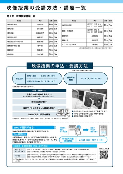 映像授業の受講方法・講座一覧高1生映像授業講座一覧講座名講師分数講数講座名講師特別選抜英語難関英語標準英語特別選抜数学特別選抜数学中高一貫難関数学中高一貫難関数学標準数学守屋佑真吉川量太胡摩﨑章秀水嶋克仁藤野真也塚本崇佐藤健人山本洋至90分90分90分90分90分90分90分90分5講5講5講5講5講5講5講5講特別選抜国語難関・標準国語難関物理難関化学ビジュアル古文常識(現代文)安達雄大(古文)山村由美子(現代文)井上真(古文)坂下由香里加藤武昭中村和之園明美分数講数90分5講90分5講90分90分90分5講5講2講*担当講師は都合により変更になる場合があります。映像授業の申込・受講方法※オンライン授業とは異なります。申込期間新規・追加8/22(木)まで変更・取りやめ7/19(金)まで*対象講座は時間割をご覧ください。申込・受講方法講座のお申し込みとお支払い他の夏期講習の講座と同様にお申し込みください。教材のお受け取り専用サイトにログインし講義を視聴※Webで質問し疑問を解消視聴可能期間7/23(火)〜9/30(月)●自分のスケジュールにあわせて受講できます。●わからない部分は繰り返し視聴できます。●自宅での視聴も可能です。※視聴方法は、申込マイページの「各種ご案内ダウンロード」から「受講上のご案内」などをご確認ください。Webで質問できる!Webで映像授業の内容に関する質問ができます。Web質問方法質問書を撮影しデータ送信カシャ!回答がWebで確認できる右記期間内に、専用サイトにてWebで質問を受け付けます。詳細は申込マイページの「各種ご案内ダウンロード」から「受講上のご案内」をご確認ください。Web質問書提出期間7/23(火)〜9/17(火)対応端末・動作推奨環境(2024年3月現在)タブレット/スマートフォン【OS:iOS14以降】ブラウザ:Safari推奨機種:iPad(第4世代)以降、iPhone5s以降【OS:Android9.x以降】ブラウザ:GoogleChromeパソコン【OS:Windows】ブラウザ:GoogleChromeの最新バージョン、MicrosoftEdgeの最新バージョン【OS:MacOSⅩ10.11以降】ブラウザ:Safari11以降、GoogleChromeの最新バージョン※OSの将来バージョン、タブレット/スマートフォンの新機種などの対応は、動作確認が完了次第、推奨環境としてご案内していきます。詳細はこちら▼