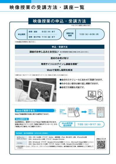 映像授業の受講方法・講座一覧映像授業の申込・受講方法※オンライン授業とは異なります。申込期間新規・追加8/22(木)まで変更・取りやめ7/19(金)まで*対象講座は時間割をご覧ください。視聴可能期間7/23(火)〜9/30(月)申込・受講方法講座のお申し込みとお支払い他の夏期講習の講座と同様にお申し込みください。教材のお受け取り専用サイトにログインし講義を視聴※Webで質問し疑問を解消※視聴方法は、申込マイページの「各種ご案内ダウンロード」から「受講上のご案内」などをご確認ください。●自分のスケジュールにあわせて受講できます。●わからない部分は繰り返し視聴できます。●自宅での視聴も可能です。Webで質問できる!Webで映像授業の内容に関する質問ができます。質問書を撮影しデータ送信カシャ!回答がWebで確認できるWeb質問方法右記期間内に、専用サイトにてWebで質問を受け付けます。詳細は申込マイページの「各種ご案内ダウンロード」から「受講上のご案内」をご確認ください。Web質問書提出期間7/23(火)〜9/17(火)対応端末・動作推奨環境(2024年3月現在)タブレット/スマートフォン【OS:iOS14以降】ブラウザ:Safari推奨機種:iPad(第4世代)以降、iPhone5s以降【OS:Android9.x以降】ブラウザ:GoogleChrome詳細はこちら▼パソコン【OS:Windows】ブラウザ:GoogleChromeの最新バージョン、MicrosoftEdgeの最新バージョン【OS:MacOSⅩ10.11以降】ブラウザ:Safari11以降、GoogleChromeの最新バージョン※OSの将来バージョン、タブレット/スマートフォンの新機種などの対応は、動作確認が完了次第、推奨環境としてご案内していきます。