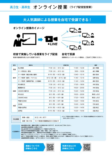 高3生・高卒生オンライン授業(ライブ配信型授業)大人気講師による授業を自宅で受講できる!オンライン授業のイメージ校舎で実施している授業をライブ配信自宅で受講教室の臨場感を感じながら受講できます。視聴端末とインターネット環境は、ご自身でご用意ください。教科英語講座名私大英語テーマ英文法・語法授業日時7/30(火)〜8/3(土)7/30(火)〜8/3(土)テーマ数学(場合の数と確率)8/19(月)〜8/23(金)数学テーマ数学(数列・ベクトル)8/12(月・振)〜8/16(金)テーマ数学(複素数平面・2次曲線)8/19(月)〜8/23(金)早大現代文難関現代文国語GMARCH現代文早大古文GMARCH古文早慶大日本史日本史早慶大世界史世界史地歴7/30(火)〜8/3(土)7/30(火)〜8/3(土)7/30(火)〜8/3(土)8/5(月)〜8/9(金)8/5(月)〜8/9(金)8/5(月)〜8/9(金)8/5(月)〜8/9(金)8/19(月)〜8/23(金)8/19(月)〜8/23(金)11:00〜12:309:00〜10:3013:40〜15:1011:40〜13:1011:20〜12:5017:20〜18:5019:20〜20:5015:20〜16:5019:20〜20:5017:20〜18:5013:20〜14:5015:20〜16:5013:20〜14:5015:20〜16:50講師成川博康成川博康森本啓夫佐野哲也森本啓夫木村哲也木村哲也木村哲也隼坂しのぶ隼坂しのぶ竹内良元竹内良元沼田英之沼田英之申込期限新規・追加8/22(木)まで※変更・取りやめライブ配信の受講開始日の4日前まで※ライブ配信を受講する場合は、ライブ配信の受講開始日の4日前までにお申し込みください。*注意事項*◆本授業は日程・講師が変更になる場合がありますので、あらかじめご了承ください。◆本授業は映像授業とは異なります。◆上記日程で行われる対面授業をライブ配信する予定です。◆2024年度夏期講習同名講座(対面/映像)と同一内容です。◆本授業担当講師に対し、授業当日やWeb質問書でご質問いただくことはできません。◆タブレットやスマートフォン、パソコンなどの機器とインターネット環境をご準備ください。◆ライブ配信を視聴できなかった場合は、見逃し配信で受講いただけます。詳細は右下の二次元コードよりご確認ください。◆推奨環境等の詳細は、右下の二次元コードよりご確認ください。講座についての詳細はこちら受講方法などの詳細はこちら