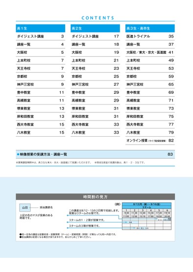 CONTENTS高1生ダイジェスト講座講座一覧大阪校上本町校天王寺校京都校神戸三宮校豊中教室高槻教室堺東教室岸和田教室西大寺教室八木教室高2生ダイジェスト講座講座一覧大阪校上本町校天王寺校京都校神戸三宮校豊中教室高槻教室堺東教室岸和田教室西大寺教室八木教室345779911111313151517181921232527292931313333高3生・高卒生医進トライアル講座一覧3537大阪校/東大・京大・医進館41上本町校天王寺校京都校神戸三宮校豊中教室高槻教室堺東教室岸和田教室西大寺教室八木教室49535965697173757779●映像授業の受講方法・講座一覧83※夏期講習期間中は、高3生も東大・京大・医進館にて受講いただけます。※現役生教室の受講対象は、高1・2・3生です。オンライン授業(ライブ配信型授業)82山田担当講師名上記の色のマスが授業のある時限です。時間割の見方(例)この講座は8/12・13の2日間で完結します。授業は3タームの6限です。3タームの1・2限が授業です。3タームの3限が授業です。●同一名称の講座は設置校舎・設置期間(ターム)・授業時間(時限)が異なっても同一内容です。●担当講師は変更になる場合がありますので、あらかじめご了承ください。8/12(月・振)〜8/16(金)19:3011:00211:2012:50池田畑中・阪上・杉井3ターム3413:4015:1015:3017:00517:2018:50619:1020:40松原8/12・13の2日間