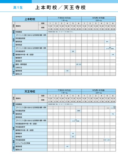 高1生7/30(火)~8/3(土)1ターム341256128/5(月)~8/9(金)2ターム34569:30〜11:0011:2013:4015:3017:2019:10〜〜〜〜〜12:5015:1017:0018:5020:409:30〜11:0011:2013:4015:3017:2019:10〜〜〜〜〜12:5015:1017:0018:5020:40映像授業の講座一覧は、83・84ページをご参照ください。宮崎北野・松村大學西内湘田8/10の1日完結杉原7/30(火)~8/3(土)1ターム341256128/5(月)~8/9(金)2ターム34569:30〜11:0011:2013:4015:3017:2019:10〜〜〜〜〜12:5015:1017:0018:5020:409:30〜11:0011:2013:4015:3017:2019:10〜〜〜〜〜12:5015:1017:0018:5020:40映像授業の講座一覧は、83・84ページをご参照ください。胡摩﨑木村8/4の1日完結木村住吉辻居西内8/10・11の2日間戸谷佐佐木・山本(ま)上本町校講座名時限時間映像講座【ダイジェスト】夏から始める入試対策英語(難関・標準)特別選抜英語難関英語標準英語【ダイジェスト】夏から始める入試対策数学(難関・標準)特別選抜数学難関数学中高一貫(速習)難関数学標準数学難関・標準国語古典文法難関物理難関化学天王寺校講座名時限時間映像講座【ダイジェスト】夏から始める入試対策英語(難関・標準)特別選抜英語難関英語標準英語【ダイジェスト】夏から始める入試対策数学(難関・標準)特別選抜数学中高一貫(速習)特別選抜数学難関数学中高一貫(速習)難関数学標準数学特別選抜国語ビジュアル古文常識難関物理難関化学教科映像英語数学国語理科教科映像英語数学国語理科上本町校/天王寺校●2024年度/夏期講習/近畿/上本町/高1生/パターン25402024_56_5_513_31_20240327204957.csv/1ページ校了時削除