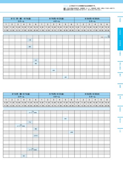 この色のマスが授業のある時限です。●同一名称の講座は設置校舎・設置期間(ターム)・授業時間(時限)が異なっても同一内容です。●担当講師は変更になる場合がありますので、あらかじめご了承ください。大阪校上本町校天王寺校京都校神戸三宮校豊中高槻堺東岸和田西大寺八木8/12(月・振)~8/16(金)123ターム3456128/19(月)~8/23(金)4ターム3456128/26(月)~8/28(水)5ターム34569:30〜11:0011:2013:4015:3017:2019:10〜〜〜〜〜12:5015:1017:0018:5020:409:30〜11:0011:2013:4015:3017:2019:10〜〜〜〜〜12:5015:1017:0018:5020:409:30〜11:0011:2013:4015:3017:2019:10〜〜〜〜〜12:5015:1017:0018:5020:40西内8/26・27の2日間土橋藤森北村湘田松尾北野8/12(月・振)~8/16(金)123ターム3456128/19(月)~8/23(金)4ターム3456128/26(月)~8/28(水)5ターム34569:30〜11:0011:2013:4015:3017:2019:10〜〜〜〜〜12:5015:1017:0018:5020:409:30〜11:0011:2013:4015:3017:2019:10〜〜〜〜〜12:5015:1017:0018:5020:409:30〜11:0011:2013:4015:3017:2019:10〜〜〜〜〜12:5015:1017:0018:5020:40西内上高原戸谷8/17の1日完結戸谷住吉8/17の1日完結瀬尾山本(洋)阪上8/17の1日完結岡内