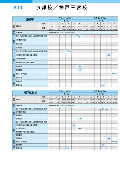 高1生7/30(火)~8/3(土)1ターム341256128/5(月)~8/9(金)2ターム34569:30〜11:0011:2013:4015:3017:2019:10〜〜〜〜〜12:5015:1017:0018:5020:409:30〜11:00映像授業の講座一覧は、83・84ページをご参照ください。11:2013:4015:3017:2019:10〜〜〜〜〜12:5015:1017:0018:5020:40京都校時限時間講座名教科映像講座映像【ダイジェスト】夏から始める入試対策英語(難関・標準)白井8/4の1日完結特別選抜英語難関英語標準英語【ダイジェスト】夏から始める入試対策数学(難関・標準)瀬古8/2・3の2日間特別選抜数学中高一貫(速習)特別選抜数学難関数学中高一貫(速習)難関数学標準数学難関・標準国語古典文法難関物理難関化学神戸三宮校講座名時限時間映像講座【ダイジェスト】夏から始める入試対策英語(難関・標準)特別選抜英語難関英語標準英語【ダイジェスト】夏から始める入試対策数学(難関・標準)特別選抜数学中高一貫(速習)特別選抜数学難関数学中高一貫(速習)難関数学標準数学難関・標準国語難関物理難関化学瀬古山下藤野野口(た)・仲大野7/30(火)~8/3(土)1ターム341256128/5(月)~8/9(金)2ターム34569:30〜11:0011:2013:4015:3017:2019:10〜〜〜〜〜12:5015:1017:0018:5020:409:30〜11:0011:2013:4015:3017:2019:10〜〜〜〜〜12:5015:1017:0018:5020:40映像授業の講座一覧は、83・84ページをご参照ください。西内8/10・11の2日間山崎駒井山本(敏)岡内湘田畑中・大村中出英語数学国語理科教科映像英語数学国語理科●2024年度/夏期講習/近畿/京都/高1生/パターン25352024_56_5_531_31_20240327114033.csv/1ページ校了時削除京都校/神戸三宮校