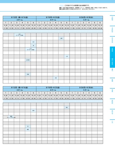 この色のマスが授業のある時限です。●同一名称の講座は設置校舎・設置期間(ターム)・授業時間(時限)が異なっても同一内容です。●担当講師は変更になる場合がありますので、あらかじめご了承ください。大阪校上本町校天王寺校京都校神戸三宮校豊中高槻堺東岸和田西大寺八木8/12(月・振)~8/16(金)123ターム3456128/19(月)~8/23(金)4ターム3456128/26(月)~8/28(水)5ターム34569:30〜11:0011:2013:4015:3017:2019:10〜〜〜〜〜12:5015:1017:0018:5020:409:30〜11:0011:2013:4015:3017:2019:10〜〜〜〜〜12:5015:1017:0018:5020:409:30〜11:0011:2013:4015:3017:2019:10〜〜〜〜〜12:5015:1017:0018:5020:40白井8/17の1日完結白井巽山下8/17の1日完結山本(敏)伊賀土橋上村大學8/12(月・振)~8/16(金)123ターム3456128/19(月)~8/23(金)4ターム3456128/26(月)~8/28(水)5ターム34569:30〜11:0011:2013:4015:3017:2019:10〜〜〜〜〜12:5015:1017:0018:5020:409:30〜11:0011:2013:4015:3017:2019:10〜〜〜〜〜12:5015:1017:0018:5020:409:30〜11:0011:2013:4015:3017:2019:10〜〜〜〜〜12:5015:1017:0018:5020:40清水藤田8/12・13の2日間西内岸藤田
