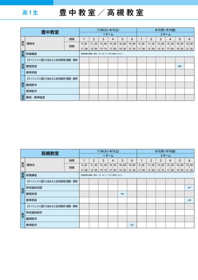 高1生7/30(火)~8/3(土)1ターム341256128/5(月)~8/9(金)2ターム34569:30〜11:0011:2013:4015:3018:0019:50〜〜〜〜〜12:5015:1017:0019:3021:209:30〜11:0011:2013:4015:3018:0019:50〜〜〜〜〜12:5015:1017:0019:3021:20映像授業の講座一覧は、83・84ページをご参照ください。藤森7/30(火)~8/3(土)1ターム341256128/5(月)~8/9(金)2ターム34569:30〜11:0011:2013:4015:3018:0019:50〜〜〜〜〜12:5015:1017:0019:3021:209:30〜11:0011:2013:4015:3018:0019:50〜〜〜〜〜12:5015:1017:0019:3021:20映像授業の講座一覧は、83・84ページをご参照ください。西田吉田松井山崎豊中教室時限時間講座名教科映像講座映像【ダイジェスト】夏から始める入試対策英語(難関・標準)難関英語標準英語【ダイジェスト】夏から始める入試対策数学(難関・標準)難関数学標準数学難関・標準国語英語数学国語【ダイジェスト】夏から始める入試対策英語(難関・標準)高槻教室時限時間講座名教科映像講座映像特別選抜英語難関英語標準英語【ダイジェスト】夏から始める入試対策数学(難関・標準)特別選抜数学難関数学標準数学英語数学豊中教室/高槻教室●2024年度/夏期講習/近畿/豊中/高1生/パターン25352024_56_5_563_31_20240325112446.csv/1ページ校了時削除
