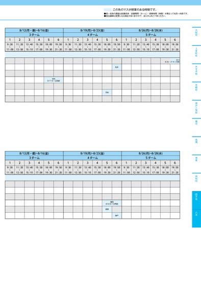 この色のマスが授業のある時限です。●同一名称の講座は設置校舎・設置期間(ターム)・授業時間(時限)が異なっても同一内容です。●担当講師は変更になる場合がありますので、あらかじめご了承ください。大阪校上本町校天王寺校京都校神戸三宮校豊中高槻堺東岸和田西大寺八木8/12(月・振)~8/16(金)123ターム3456128/19(月)~8/23(金)4ターム3456128/26(月)~8/28(水)5ターム34569:30〜11:0011:2013:4015:3018:0019:50〜〜〜〜〜12:5015:1017:0019:3021:209:30〜11:0011:2013:4015:3018:0019:50〜〜〜〜〜12:5015:1017:0019:3021:209:30〜11:0011:2013:4015:3018:0019:50〜〜〜〜〜12:5015:1017:0019:3021:20河村8/17の1日完結松井河村江川8/26・27の2日間8/12(月・振)~8/16(金)123ターム3456128/19(月)~8/23(金)4ターム3456128/26(月)~8/28(水)5ターム34569:30〜11:0011:2013:4015:3018:0019:50〜〜〜〜〜12:5015:1017:0019:3021:209:30〜11:0011:2013:4015:3018:0019:50〜〜〜〜〜12:5015:1017:0019:3021:209:30〜11:0011:2013:4015:3018:0019:50〜〜〜〜〜12:5015:1017:0019:3021:20信岡8/24の1日完結信岡髙戸