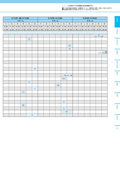 この色のマスが授業のある時限です。●同一名称の講座は設置校舎・設置期間(ターム)・授業時間(時限)が異なっても同一内容です。●担当講師は変更になる場合がありますので、あらかじめご了承ください。大阪校上本町校天王寺校京都校神戸三宮校豊中高槻堺東岸和田西大寺八木8/12(月・振)~8/16(金)123ターム3456128/19(月)~8/23(金)4ターム3456128/26(月)~8/28(水)5ターム34569:30〜11:0011:2013:4015:3017:2019:1012:5015:1017:0018:5020:40〜〜〜〜〜9:30〜11:0011:2013:4015:3017:2019:10〜〜〜〜〜12:5015:1017:0018:5020:409:30〜11:0011:2013:4015:3017:2019:10〜〜〜〜〜12:5015:1017:0018:5020:40木下8/26・27の2日間瀬古8/26・27の2日間江本山口中田仲上住山口植田香川原田畑中・阪上・幸重佐佐木北野古川西高木