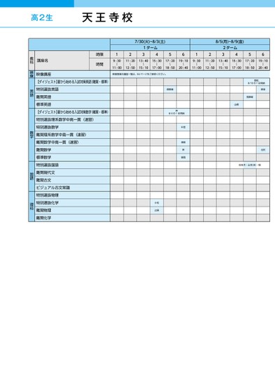 高2生7/30(火)~8/3(土)1ターム341256128/5(月)~8/9(金)2ターム34569:30〜11:0011:2013:4015:3017:2019:10〜〜〜〜〜12:5015:1017:0018:5020:409:30〜11:0011:2013:4015:3017:2019:10〜〜〜〜〜12:5015:1017:0018:5020:40映像授業の講座一覧は、84ページをご参照ください。胡摩﨑岸8/4の1日完結中田湘田岸信岡小松辻居国松8/10の1日完結原田胡摩﨑山崎北村佐佐木・山本(ま)・畑講座名時限時間映像講座【ダイジェスト】夏から始める入試対策英語(難関・標準)特別選抜英語難関英語標準英語【ダイジェスト】夏から始める入試対策数学(難関・標準)特別選抜理系数学中高一貫(速習)特別選抜数学難関理系数学中高一貫(速習)難関数学中高一貫(速習)難関数学標準数学特別選抜国語難関現代文難関古文ビジュアル古文常識特別選抜物理特別選抜化学難関物理難関化学教科映像英語数学国語理科天王寺校●2024年度/夏期講習/近畿/天王寺/高2生/パターン25402024_56_5_515_32_20240328094311.csv/1ページ校了時削除