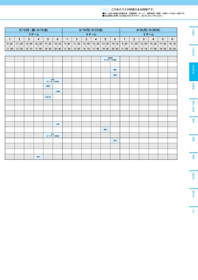 この色のマスが授業のある時限です。●同一名称の講座は設置校舎・設置期間(ターム)・授業時間(時限)が異なっても同一内容です。●担当講師は変更になる場合がありますので、あらかじめご了承ください。大阪校上本町校天王寺校京都校神戸三宮校豊中高槻堺東岸和田西大寺八木8/12(月・振)~8/16(金)123ターム3456128/19(月)~8/23(金)4ターム3456128/26(月)~8/28(水)5ターム34569:30〜11:0011:2013:4015:3017:2019:1012:5015:1017:0018:5020:40〜〜〜〜〜9:30〜11:0011:2013:4015:3017:2019:10〜〜〜〜〜12:5015:1017:0018:5020:409:30〜11:0011:2013:4015:3017:2019:10〜〜〜〜〜12:5015:1017:0018:5020:40胡摩﨑8/24の1日完結国松津留菅井吉田湘田8/17の1日完結瀬尾上高原山本(洋)江濵阪上8/17の1日完結岡内