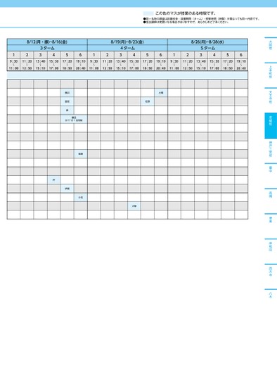 この色のマスが授業のある時限です。●同一名称の講座は設置校舎・設置期間(ターム)・授業時間(時限)が異なっても同一内容です。●担当講師は変更になる場合がありますので、あらかじめご了承ください。大阪校上本町校天王寺校京都校神戸三宮校豊中高槻堺東岸和田西大寺八木8/12(月・振)~8/16(金)123ターム3456128/19(月)~8/23(金)4ターム3456128/26(月)~8/28(水)5ターム34569:30〜11:0011:2013:4015:3017:2019:1012:5015:1017:0018:5020:40〜〜〜〜〜9:30〜11:0011:2013:4015:3017:2019:10〜〜〜〜〜12:5015:1017:0018:5020:409:30〜11:0011:2013:4015:3017:2019:10〜〜〜〜〜12:5015:1017:0018:5020:40横井堂前巽藤田8/17の1日完結宮崎小松仲伊賀土橋佐野大學