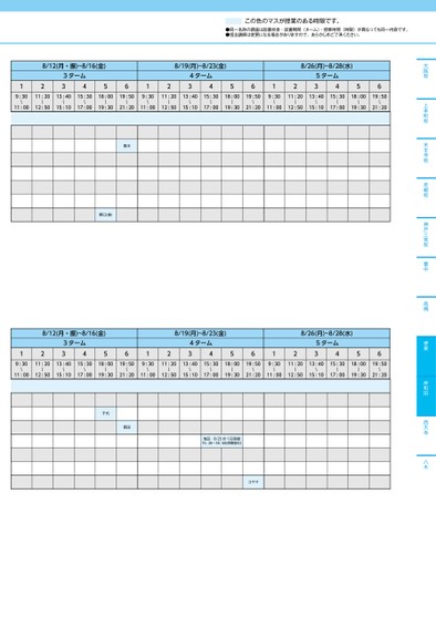 この色のマスが授業のある時限です。●同一名称の講座は設置校舎・設置期間(ターム)・授業時間(時限)が異なっても同一内容です。●担当講師は変更になる場合がありますので、あらかじめご了承ください。大阪校上本町校天王寺校京都校神戸三宮校豊中高槻堺東岸和田西大寺八木8/12(月・振)~8/16(金)123ターム3456128/19(月)~8/23(金)4ターム3456128/26(月)~8/28(水)5ターム34569:30〜11:0011:2013:4015:3018:0019:50〜〜〜〜〜12:5015:1017:0019:3021:209:30〜11:0011:2013:4015:3018:0019:50〜〜〜〜〜12:5015:1017:0019:3021:209:30〜11:0011:2013:4015:3018:0019:50〜〜〜〜〜12:5015:1017:0019:3021:20青木野口(良)8/12(月・振)~8/16(金)123ターム3456128/19(月)~8/23(金)4ターム3456128/26(月)~8/28(水)5ターム34569:30〜11:0011:2013:4015:3018:0019:50〜〜〜〜〜12:5015:1017:0019:3021:209:30〜11:0011:2013:4015:3018:0019:50〜〜〜〜〜12:5015:1017:0019:3021:209:30〜11:0011:2013:4015:3018:0019:50〜〜〜〜〜12:5015:1017:0019:3021:20千代西田池田8/25の1日完結15:30〜18:50(休憩含む)コヤマ