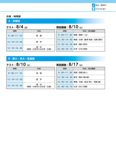 日程・時間割A:京都校テスト:8/4(日)時間9:30~11:1012:10~13:50科目英語数学14:10~16:40理科(物理・化学または化学・生物)B:東大・京大・医進館テスト:8/10(土)時間9:30~11:1012:10~13:50科目英語数学14:10~16:40理科(物理・化学または化学・生物)採点・添削ありテストゼミあり解説講義:8/10(土)時間科目/担当講師9:30~11:30英語(島原一之)12:30~14:00物理/生物(瀧澤和樹/加賀健司)14:20~16:20数学(瀬古泰世)16:40~18:10化学(小松知修)解説講義:8/17(土)時間科目/担当講師9:30~11:30英語(西岡直人)12:30~14:30数学(駒井健太郎)14:50~16:20物理/生物(吉田秀仁/西尾健)16:40~18:10化学(古川哲嗣)