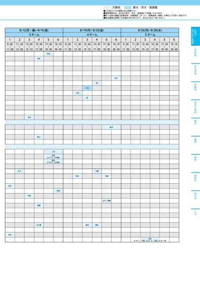 この色のマスが授業のある時限です。●同一名称の講座は設置校舎・設置期間(ターム)・授業時間(時限)が異なっても同一内容です。●担当講師は変更になる場合がありますので、あらかじめご了承ください。大阪校/東大・京大・医進館上本町校天王寺校京都校神戸三宮校豊中高槻堺東岸和田西大寺八木大阪校東大・京大・医進館●この色のマスが授業のある時限です。●講習期間中は、高3生も東大・京大・医進館にて受講いただけます。●同一名称の講座は設置校舎・設置期間(ターム)・授業時間(時限)が異なっても同一内容です。●担当講師は変更になる場合がありますので、あらかじめご了承ください。8/12(月・振)~8/16(金)123ターム3456128/19(月)~8/23(金)4ターム3456128/26(月)~8/28(水)5ターム34569:30〜11:0011:2013:4015:3017:2019:10〜〜〜〜〜12:5015:1017:0018:5020:409:30〜11:0011:2013:4015:3017:2019:10〜〜〜〜〜12:5015:1017:0018:5020:409:30〜11:0011:2013:4015:3017:2019:10〜〜〜〜〜12:5015:1017:0018:5020:40吉田池本中田影山上住河野8/17の1日完結高松8/18の1日完結古川西小松小松西高木木下刀香川刀寺尾中崎高橋中土居山口・幸重高松高松池谷河合8/263・4限、8/273・4限、8/283限河合