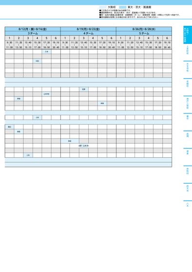 この色のマスが授業のある時限です。●同一名称の講座は設置校舎・設置期間(ターム)・授業時間(時限)が異なっても同一内容です。●担当講師は変更になる場合がありますので、あらかじめご了承ください。大阪校/東大・京大・医進館上本町校天王寺校京都校神戸三宮校豊中高槻堺東岸和田西大寺八木大阪校東大・京大・医進館●この色のマスが授業のある時限です。●講習期間中は、高3生も東大・京大・医進館にて受講いただけます。●同一名称の講座は設置校舎・設置期間(ターム)・授業時間(時限)が異なっても同一内容です。●担当講師は変更になる場合がありますので、あらかじめご了承ください。8/12(月・振)~8/16(金)123ターム3456128/19(月)~8/23(金)4ターム3456128/26(月)~8/28(水)5ターム34569:30〜11:0011:2013:4015:3017:2019:10〜〜〜〜〜12:5015:1017:0018:5020:409:30〜11:0011:2013:4015:3017:2019:10〜〜〜〜〜12:5015:1017:0018:5020:409:30〜11:0011:2013:4015:3017:2019:10〜〜〜〜〜12:5015:1017:0018:5020:40久末中田山本(和)神坂佐野神坂上住島田島田上住島田北野・山本(ま)