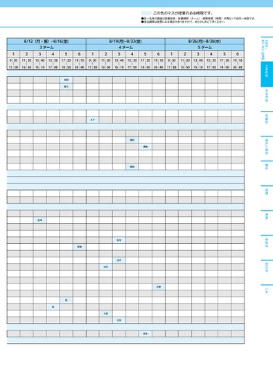 この色のマスが授業のある時限です。●同一名称の講座は設置校舎・設置期間(ターム)・授業時間(時限)が異なっても同一内容です。●担当講師は変更になる場合がありますので、あらかじめご了承ください。大阪校/東大・京大・医進館上本町校天王寺校京都校神戸三宮校豊中高槻堺東岸和田西大寺八木8/12(月・振)~8/16(金)123ターム3456128/19(月)~8/23(金)4ターム3456128/26(月)~8/28(水)5ターム34569:30〜11:0011:2013:4015:3017:2019:1012:5015:1017:0018:5020:40〜〜〜〜〜9:30〜11:0011:2013:4015:3017:2019:10〜〜〜〜〜12:5015:1017:0018:5020:409:30〜11:0011:2013:4015:3017:2019:10〜〜〜〜〜12:5015:1017:0018:5020:40西岡香川木下瀬尾藤田瀬尾松尾高橋西西松尾池本池本大西大西北野宮本