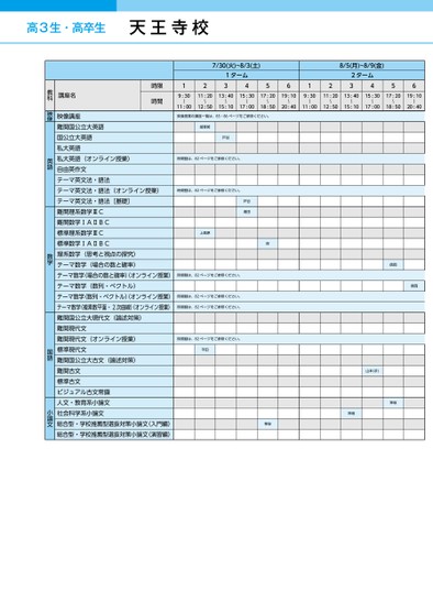 高3生・高卒生7/30(火)~8/3(土)1ターム341256128/5(月)~8/9(金)2ターム34569:30〜11:0011:2013:4015:3017:2019:10〜〜〜〜〜12:5015:1017:0018:5020:409:30〜11:0011:2013:4015:3017:2019:10〜〜〜〜〜12:5015:1017:0018:5020:40映像授業の講座一覧は、85・86ページをご参照ください。胡摩﨑戸谷時間割は、82ページをご参照ください。時間割は、82ページをご参照ください。戸谷湘田上高原岸時間割は、82ページをご参照ください。時間割は、82ページをご参照ください。時間割は、82ページをご参照ください。時間割は、82ページをご参照ください。平田信岡信岡山本(ま)神坂神坂神坂講座名時限時間映像講座難関国公立大英語国公立大英語私大英語私大英語(オンライン授業)自由英作文テーマ英文法・語法テーマ英文法・語法(オンライン授業)テーマ英文法・語法[基礎]難関理系数学ⅢC難関数学ⅠAⅡBC標準理系数学ⅢC標準数学ⅠAⅡBC理系数学(思考と視点の探究)テーマ数学(場合の数と確率)テーマ数学(場合の数と確率)オンライン授業)テーマ数学(数列・ベクトル)テーマ数学(数列・ベクトル)オンライン授業)テーマ数学(複素数平面・2次曲線)オンライン授業)難関国公立大現代文(論述対策)難関現代文難関現代文(オンライン授業)標準現代文難関国公立大古文(論述対策)難関古文標準古文ビジュアル古文常識人文・教育系小論文社会科学系小論文総合型・学校推薦型選抜対策小論文(入門編)総合型・学校推薦型選抜対策小論文(演習編)教科映像英語数学国語小論文天王寺校●2024年度/夏期講習/近畿/天王寺/高3・卒生/パターン25452024_56_5_515_11_20240328104047.csv/1ページ校了時削除