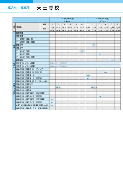 高3生・高卒生7/30(火)~8/3(土)1ターム341256128/5(月)~8/9(金)2ターム34569:30〜11:0011:2013:4015:3017:2019:10〜〜〜〜〜12:5015:1017:0018:5020:409:30〜11:0011:2013:4015:3017:2019:10〜〜〜〜〜12:5015:1017:0018:5020:40時間割は、82ページをご参照ください。時間割は、82ページをご参照ください。小松岡内岡内大西胡摩﨑上高原山下青野・畑山本(ま)・畑内藤井上影山河野時限時間講座名教科難関物理標準物理テーマ物理(磁気・熱)テーマ物理(波動・電気)難関化学標準化学テーマ化学(有機)テーマ化学(無機)テーマ化学(有機)基礎]難関生物日本史(オンライン授業)世界史(オンライン授業)共通テスト対策英語(リーディング)共通テスト対策英語(リスニング)共通テスト対策数学ⅠA共通テスト対策数学ⅠA(旧課程)共通テスト対策数学(ⅡB+ベクトル型)共通テスト対策現代文共通テスト対策古典共通テスト対策化学共通テスト対策歴史総合,日本史探究共通テスト対策日本史B(旧課程)共通テスト対策歴史総合,世界史探究共通テスト対策世界史B(旧課程)共通テスト対策地理総合,地理探究(旧課程も対応)共通テスト対策倫理,政治・経済(旧課程)理科地歴共通テスト対策天王寺校●2024年度/夏期講習/近畿/天王寺/高3・卒生/パターン25452024_56_5_515_11_20240328104047.csv/2ページ校了時削除