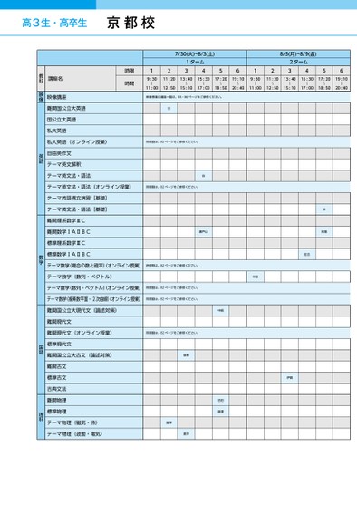 高3生・高卒生7/30(火)~8/3(土)1ターム341256128/5(月)~8/9(金)2ターム34569:30〜11:0011:2013:4015:3017:2019:10〜〜〜〜〜12:5015:1017:0018:5020:409:30〜11:00映像授業の講座一覧は、85・86ページをご参照ください。谷11:2013:4015:3017:2019:10〜〜〜〜〜12:5015:1017:0018:5020:40時限時間難関国公立大英語国公立大英語私大英語講座名教科映像講座映像テーマ英語構文演習[基礎]テーマ英文法・語法[基礎]難関理系数学ⅢC難関数学ⅠAⅡBC標準理系数学ⅢC標準数学ⅠAⅡBC瀬戸山谷馬場住吉テーマ数学(場合の数と確率)オンライン授業)時間割は、82ページをご参照ください。テーマ数学(数列・ベクトル)中田テーマ数学(数列・ベクトル)オンライン授業)時間割は、82ページをご参照ください。テーマ数学(複素数平面・2次曲線)オンライン授業)時間割は、82ページをご参照ください。難関国公立大現代文(論述対策)難関現代文難関現代文(オンライン授業)時間割は、82ページをご参照ください。標準現代文難関国公立大古文(論述対策)塚野難関古文標準古文古典文法難関物理標準物理テーマ物理(磁気・熱)テーマ物理(波動・電気)瀧澤瀧澤中崎吉田瀧澤伊賀数学国語理科私大英語(オンライン授業)時間割は、82ページをご参照ください。谷テーマ英文法・語法自由英作文テーマ英文解釈英語テーマ英文法・語法(オンライン授業)時間割は、82ページをご参照ください。●2024年度/夏期講習/近畿/京都/高3・卒生/パターン25352024_56_5_531_11_20240404171041.csv/1ページ校了時削除京都校