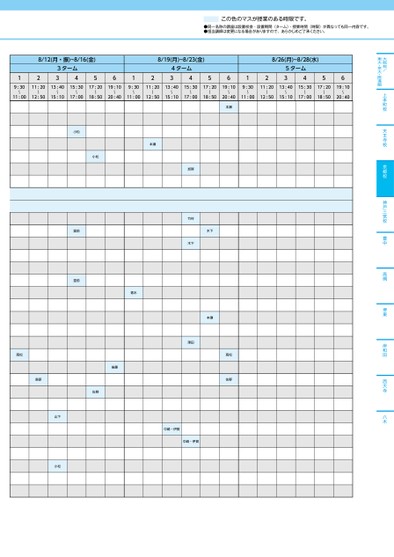 この色のマスが授業のある時限です。●同一名称の講座は設置校舎・設置期間(ターム)・授業時間(時限)が異なっても同一内容です。●担当講師は変更になる場合がありますので、あらかじめご了承ください。大阪校/東大・京大・医進館上本町校天王寺校京都校神戸三宮校豊中高槻堺東岸和田西大寺八木8/12(月・振)~8/16(金)123ターム3456128/19(月)~8/23(金)4ターム3456128/26(月)~8/28(水)5ターム34569:30〜11:0011:2013:4015:3017:2019:1012:5015:1017:0018:5020:40〜〜〜〜〜9:30〜11:0011:2013:4015:3017:2019:10〜〜〜〜〜12:5015:1017:0018:5020:409:30〜11:0011:2013:4015:3017:2019:10〜〜〜〜〜12:5015:1017:0018:5020:40本瀬小松小松堂前堂前青木高松島原後藤佐野本瀬高松佐野加賀竹村木下澤田木下本瀬山下小松中崎・伊賀中崎・伊賀