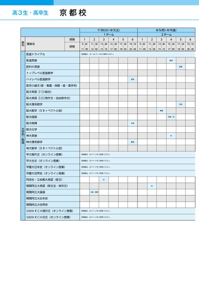 高3生・高卒生7/30(火)~8/3(土)1ターム341256128/5(月)~8/9(金)2ターム34569:30〜11:0011:2013:4015:3017:2019:10〜〜〜〜〜12:5015:1017:0018:5020:409:30〜11:0011:2013:4015:3017:2019:10〜〜〜〜〜12:5015:1017:0018:5020:40時間割は、35・36ページをご参照ください。島原島原河村瀬尾中崎・仲谷堂前吉田藤田時間割は、82ページをご参照ください。時間割は、82ページをご参照ください。時間割は、82ページをご参照ください。時間割は、82ページをご参照ください。谷江濵・塚野谷時限時間医進トライアル医進英語医科大英語トップレベル医進数学ハイレベル医進数学講座名教科医系小論文(医・看護・保健・歯・薬学系)阪大英語【1】総合)阪大英語【2】英作文・自由英作文)阪大理系数学阪大数学(ⅡB+ベクトル型)神大数学(ⅡB+ベクトル型)早大現代文(オンライン授業)早大古文(オンライン授業)早慶大日本史(オンライン授業)早慶大世界史(オンライン授業)同志社・立命館大英語(長文)関関同立大英語(英文法・英作文)関関同立大国語関関同立大日本史関関同立大世界史阪大国語阪大物理阪大化学神大英語神大理系数学大学別/医進GMARCH現代文(オンライン授業)時間割は、82ページをご参照ください。GMARCH古文(オンライン授業)時間割は、82ページをご参照ください。●2024年度/夏期講習/近畿/京都/高3・卒生/パターン25352024_56_5_531_11_20240404171041.csv/3ページ校了時削除京都校