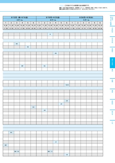 この色のマスが授業のある時限です。●同一名称の講座は設置校舎・設置期間(ターム)・授業時間(時限)が異なっても同一内容です。●担当講師は変更になる場合がありますので、あらかじめご了承ください。大阪校/東大・京大・医進館上本町校天王寺校京都校神戸三宮校豊中高槻堺東岸和田西大寺八木8/12(月・振)~8/16(金)123ターム3456128/19(月)~8/23(金)4ターム3456128/26(月)~8/28(水)5ターム34569:30〜11:0011:2013:4015:3017:2019:1012:5015:1017:0018:5020:40〜〜〜〜〜9:30〜11:0011:2013:4015:3017:2019:10〜〜〜〜〜12:5015:1017:0018:5020:409:30〜11:0011:2013:4015:3017:2019:10〜〜〜〜〜12:5015:1017:0018:5020:40慎島原国松島田藤野涌谷一番合戦辻居辻居岡内北野西内藤野瀬島・永松瀬島・八木上村小倉