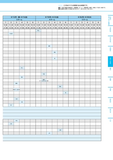 この色のマスが授業のある時限です。●同一名称の講座は設置校舎・設置期間(ターム)・授業時間(時限)が異なっても同一内容です。●担当講師は変更になる場合がありますので、あらかじめご了承ください。大阪校/東大・京大・医進館上本町校天王寺校京都校神戸三宮校豊中高槻堺東岸和田西大寺八木8/12(月・振)~8/16(金)123ターム3456128/19(月)~8/23(金)4ターム3456128/26(月)~8/28(水)5ターム34569:30〜11:0011:2013:4015:3017:2019:1012:5015:1017:0018:5020:40〜〜〜〜〜9:30〜11:0011:2013:4015:3017:2019:10〜〜〜〜〜12:5015:1017:0018:5020:409:30〜11:0011:2013:4015:3017:2019:10〜〜〜〜〜12:5015:1017:0018:5020:40中土居影山島原涌谷乾平田西内8/19〜8/21の3日間涌谷乾小倉上住井上西内藤田佐佐木・山本(ま)久末木村岸戸谷久末