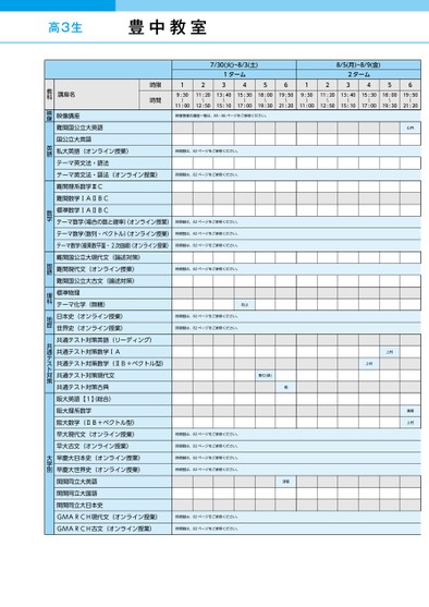 高3生7/30(火)~8/3(土)1ターム341256128/5(月)~8/9(金)2ターム34569:30〜11:0011:2013:4015:3018:0019:50〜〜〜〜〜12:5015:1017:0019:3021:209:30〜11:0011:2013:4015:3018:0019:50〜〜〜〜〜12:5015:1017:0019:3021:20山内瀬尾上村上村上村映像授業の講座一覧は、85・86ページをご参照ください。時間割は、82ページをご参照ください。時間割は、82ページをご参照ください。時間割は、82ページをご参照ください。時間割は、82ページをご参照ください。時間割は、82ページをご参照ください。時間割は、82ページをご参照ください。北山時間割は、82ページをご参照ください。時間割は、82ページをご参照ください。野口(良)堀津留時間割は、82ページをご参照ください。時間割は、82ページをご参照ください。時間割は、82ページをご参照ください。時間割は、82ページをご参照ください。時間割は、82ページをご参照ください。時間割は、82ページをご参照ください。講座名時限時間映像講座難関国公立大英語国公立大英語私大英語(オンライン授業)テーマ英文法・語法テーマ英文法・語法(オンライン授業)難関理系数学ⅢC難関数学ⅠAⅡBC標準数学ⅠAⅡBCテーマ数学(場合の数と確率)オンライン授業)テーマ数学(数列・ベクトル)オンライン授業)テーマ数学(複素数平面・2次曲線)オンライン授業)難関国公立大現代文(論述対策)難関現代文(オンライン授業)難関国公立大古文(論述対策)標準物理テーマ化学(無機)日本史(オンライン授業)世界史(オンライン授業)共通テスト対策英語(リーディング)共通テスト対策数学ⅠA共通テスト対策数学(ⅡB+ベクトル型)共通テスト対策現代文共通テスト対策古典阪大英語【1】総合)阪大理系数学阪大数学(ⅡB+ベクトル型)早大現代文(オンライン授業)早大古文(オンライン授業)早慶大日本史(オンライン授業)早慶大世界史(オンライン授業)関関同立大英語関関同立大国語関関同立大日本史GMARCH現代文(オンライン授業)GMARCH古文(オンライン授業)教科映像英語数学国語理科地歴共通テスト対策大学別豊中教室●2024年度/夏期講習/近畿/豊中/高3・卒生/パターン25402024_56_5_563_11_20240326160624.csv/1ページ校了時削除