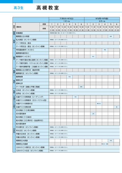 高3生7/30(火)~8/3(土)1ターム341256128/5(月)~8/9(金)2ターム34569:30〜11:0011:2013:4015:3018:0019:50〜〜〜〜〜12:5015:1017:0019:3021:209:30〜11:0011:2013:4015:3018:0019:50〜〜〜〜〜12:5015:1017:0019:3021:20映像授業の講座一覧は、85・86ページをご参照ください。時間割は、82ページをご参照ください。時間割は、82ページをご参照ください。時間割は、82ページをご参照ください。時間割は、82ページをご参照ください。時間割は、82ページをご参照ください。時間割は、82ページをご参照ください。中出時間割は、82ページをご参照ください。時間割は、82ページをご参照ください。岡内三枝時間割は、82ページをご参照ください。時間割は、82ページをご参照ください。時間割は、82ページをご参照ください。時間割は、82ページをご参照ください。時間割は、82ページをご参照ください。時間割は、82ページをご参照ください。松井中田中川野口(た)堀上村下村野口(た)・島田講座名時限時間映像講座難関国公立大英語私大英語(オンライン授業)テーマ英文法・語法テーマ英文法・語法(オンライン授業)特別選抜数学ⅠAⅡBC難関理系数学ⅢC難関数学ⅠAⅡBCテーマ数学(場合の数と確率)オンライン授業)テーマ数学(数列・ベクトル)オンライン授業)テーマ数学(複素数平面・2次曲線)オンライン授業)難関国公立大現代文(論述対策)難関現代文(オンライン授業)難関物理難関化学標準化学テーマ化学(速度と平衡)発展]日本史(オンライン授業)世界史(オンライン授業)共通テスト対策英語(リーディング)共通テスト対策数学(ⅡB+ベクトル型)共通テスト対策現代文共通テスト対策古典京大英語【1】英文解釈)京大理系数学阪大英語【1】総合)阪大英語【2】英作文・自由英作文)阪大理系数学早大現代文(オンライン授業)早大古文(オンライン授業)早慶大日本史(オンライン授業)早慶大世界史(オンライン授業)関関同立大英語関関同立大国語GMARCH現代文(オンライン授業)GMARCH古文(オンライン授業)教科映像英語数学国語理科地歴共通テスト対策大学別高槻教室●2024年度/夏期講習/近畿/高槻教室/高3・卒生/パターン25402024_56_5_540_11_20240404171041.csv/1ページ校了時削除