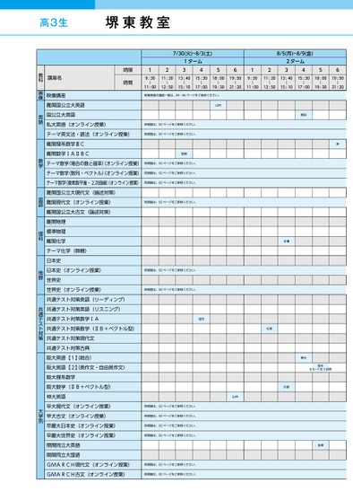 高3生7/30(火)~8/3(土)1ターム341256128/5(月)~8/9(金)2ターム34569:30〜11:0011:2013:4015:3018:0019:50〜〜〜〜〜12:5015:1017:0019:3021:209:30〜11:0011:2013:4015:3018:0019:50〜〜〜〜〜12:5015:1017:0019:3021:20映像授業の講座一覧は、85・86ページをご参照ください。山内時間割は、82ページをご参照ください。時間割は、82ページをご参照ください。信岡時間割は、82ページをご参照ください。時間割は、82ページをご参照ください。時間割は、82ページをご参照ください。時間割は、82ページをご参照ください。時間割は、82ページをご参照ください。時間割は、82ページをご参照ください。西田岸本瀬池田杉原杉原山内青木青木8/5〜7の3日間金澤時間割は、82ページをご参照ください。時間割は、82ページをご参照ください。時間割は、82ページをご参照ください。時間割は、82ページをご参照ください。時間割は、82ページをご参照ください。時間割は、82ページをご参照ください。講座名時限時間映像講座難関国公立大英語国公立大英語私大英語(オンライン授業)テーマ英文法・語法(オンライン授業)難関理系数学ⅢC難関数学ⅠAⅡBCテーマ数学(場合の数と確率)オンライン授業)テーマ数学(数列・ベクトル)オンライン授業)テーマ数学(複素数平面・2次曲線)オンライン授業)難関国公立大現代文(論述対策)難関現代文(オンライン授業)難関国公立大古文(論述対策)難関物理標準物理難関化学テーマ化学(無機)日本史日本史(オンライン授業)世界史世界史(オンライン授業)共通テスト対策英語(リーディング)共通テスト対策英語(リスニング)共通テスト対策数学ⅠA共通テスト対策数学(ⅡB+ベクトル型)共通テスト対策現代文共通テスト対策古典阪大英語【1】総合)阪大英語【2】英作文・自由英作文)阪大理系数学阪大数学(ⅡB+ベクトル型)神大英語早大現代文(オンライン授業)早大古文(オンライン授業)早慶大日本史(オンライン授業)早慶大世界史(オンライン授業)関関同立大英語関関同立大国語GMARCH現代文(オンライン授業)GMARCH古文(オンライン授業)教科映像英語数学国語理科地歴共通テスト対策大学別●2024年度/夏期講習/近畿/堺東/高3・卒生/パターン25402024_56_5_533_11_20240326160339.csv/1ページ校了時削除堺東教室