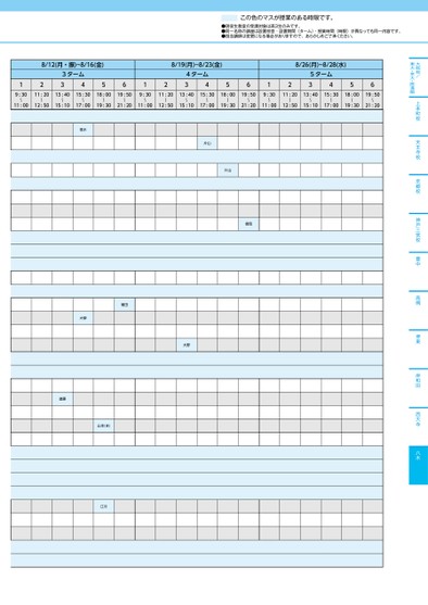 この色のマスが授業のある時限です。●現役生教室の受講対象は高3生のみです。●同一名称の講座は設置校舎・設置期間(ターム)・授業時間(時限)が異なっても同一内容です。●担当講師は変更になる場合がありますので、あらかじめご了承ください。大阪校/東大・京大・医進館上本町校天王寺校京都校神戸三宮校豊中高槻堺東岸和田西大寺八木8/12(月・振)~8/16(金)123ターム3456128/19(月)~8/23(金)4ターム3456128/26(月)~8/28(水)5ターム34569:30〜11:0011:2013:4015:3018:0019:5012:5015:1017:0019:3021:20〜〜〜〜〜9:30〜11:0011:2013:4015:3018:0019:50〜〜〜〜〜12:5015:1017:0019:3021:209:30〜11:0011:2013:4015:3018:0019:50〜〜〜〜〜12:5015:1017:0019:3021:20青木片山片山信岡植田大學大野進藤山本(ま)江川