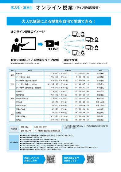 高3生・高卒生オンライン授業(ライブ配信型授業)大人気講師による授業を自宅で受講できる!オンライン授業のイメージ校舎で実施している授業をライブ配信自宅で受講教室の臨場感を感じながら受講できます。視聴端末とインターネット環境は、ご自身でご用意ください。教科英語講座名私大英語テーマ英文法・語法テーマ数学(場合の数と確率)授業日時7/30(火)〜8/3(土)7/30(火)〜8/3(土)11:00〜12:3009:00〜10:308/19(月)〜8/23(金)13:40〜15:10数学テーマ数学(数列・ベクトル)8/12(月・振)〜8/16(金)11:40〜13:10テーマ数学(複素数平面・2次曲線)早大現代文難関現代文国語GMARCH現代文早大古文GMARCH古文早慶大日本史日本史早慶大世界史世界史地歴8/19(月)〜8/23(金)11:20〜12:507/30(火)〜8/3(土)7/30(火)〜8/3(土)7/30(火)〜8/3(土)8/5(月)〜8/9(金)8/5(月)〜8/9(金)8/5(月)〜8/9(金)8/5(月)〜8/9(金)17:20〜18:5019:20〜20:5015:20〜16:5019:20〜20:5017:20〜18:5013:20〜14:5015:20〜16:508/19(月)〜8/23(金)13:20〜14:508/19(月)〜8/23(金)15:20〜16:50講師成川博康成川博康森本啓夫佐野哲也森本啓夫木村哲也木村哲也木村哲也隼坂しのぶ隼坂しのぶ竹内良元竹内良元沼田英之沼田英之申込期限新規・追加8/22(木)まで※変更・取りやめライブ配信の受講開始日の4日前まで※ライブ配信を受講する場合は、ライブ配信の受講開始日の4日前までにお申し込みください。*注意事項*◆本授業は日程・講師が変更になる場合がありますので、あらかじめご了承ください。◆本授業は映像授業とは異なります。◆上記日程で行われる対面授業をライブ配信する予定です。◆2024年度夏期講習同名講座(対面/映像)と同一内容です。◆本授業担当講師に対し、授業当日やWeb質問書でご質問いただくことはできません。◆タブレットやスマートフォン、パソコンなどの機器とインターネット環境をご準備ください。◆ライブ配信を視聴できなかった場合は、見逃し配信で受講いただけます。詳細は右下の二次元コードよりご確認ください。◆推奨環境等の詳細は、右下の二次元コードよりご確認ください。講座についての詳細はこちら受講方法などの詳細はこちら