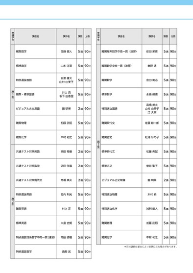 佐藤健人5講90分難関理系数学中高一貫(速習)依田栄喜5講90分山本洋至5講90分難関数学中高一貫(速習)秦野透5講90分講座名講師名講数分数受講学年講座名講師名講数分数難関数学標準数学受講学年5講90分難関数学宮田篤志5講90分5講90分標準数学永島健徳5講90分安達雄大山村由美子井上真坂下由香里特別選抜国語難関・標準国語高1生ビジュアル古文常識園明美2講90分特別選抜国語高橋英夫山村由美子江久実5講90分加藤武昭5講90分難関現代文佐藤総一郎5講90分中村和之5講90分難関古文松浦かの子5講90分高2生難関物理難関化学共通テスト対策英語柴田祐樹2講90分標準現代文松藤央記5講90分共通テスト対策数学依田栄喜2講90分標準古文菅井聖子5講90分共通テスト対策現代文高橋英夫2講90分ビジュアル古文常識園明美2講90分特別選抜英語竹内利光5講90分特別選抜物理木村純5講90分村上正5講90分特別選抜化学浅利魁人5講90分大島史朗5講90分難関物理加藤武昭5講90分難関英語標準英語高2生特別選抜理系数学中高一貫(速習)高田直樹5講90分難関化学中村和之5講90分特別選抜数学西畑武5講90分*担当講師は都合により変更になる場合があります。
