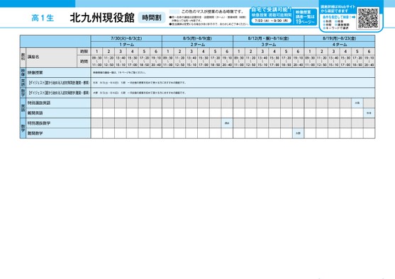 高1生北九州現役館時間割この色のマスが授業のある時限です。●同一名称の講座は設置校舎・設置期間(ターム)・授業時間(時限)が異なっても同一内容です。●担当講師は変更になる場合がありますので、あらかじめご了承ください。自宅で受講可能!映像授業視聴可能期間7/23(火)〜9/30(月)映像授業講座一覧は19ページ〜19ページ〜講座詳細はWebサイトから確認できます条件を指定して検索!●科目●校舎●日程●講座種類●キーワードで選択7/30(火)~8/3(土)1ターム341256128/5(月)~8/9(金)2ターム348/12(月・振)~8/16(金)8/19(月)~8/23(金)56123ターム3456124ターム345609:3011:2013:4015:3017:2019:1009:3011:2013:4015:3017:2019:1009:3011:2013:4015:3017:2019:1009:3011:2013:4015:3017:2019:1011:0012:5015:1017:0018:5020:4011:0012:5015:1017:0018:5020:4011:0012:5015:1017:0018:5020:4011:0012:5015:1017:0018:5020:40〜〜〜〜〜〜〜〜〜〜〜〜〜〜〜〜〜〜〜〜〜〜〜〜映像授業の講座一覧は、19ページをご覧ください。時限時間講座名教科映像授業映像清水大野久我杉本【ダイジェスト】夏から始める入試対策英語(難関・標準)杉本8/3(土)・8/4(日)5限←河合塾の授業を初めて受ける方におすすめの講座です。【ダイジェスト】夏から始める入試対策数学(難関・標準)大野8/3(土)・8/4(日)6限←河合塾の授業を初めて受ける方におすすめの講座です。特別選抜英語難関英語特別選抜数学難関数学英語数学英語数学●2024年度/夏期講習/九州/745/高1生/パターン34402024_56_7_745_31_20240328220518.csv/1ページ校了時削除