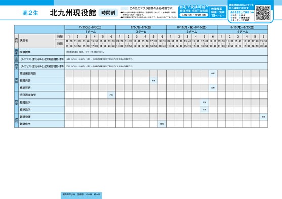7/30(火)~8/3(土)1ターム341256128/5(月)~8/9(金)2ターム348/12(月・振)~8/16(金)8/19(月)~8/23(金)56123ターム3456124ターム345609:3011:2013:4015:3017:2019:1009:3011:2013:4015:3017:2019:1009:3011:2013:4015:3017:2019:1009:3011:2013:4015:3017:2019:1011:0012:5015:1017:0018:5020:4011:0012:5015:1017:0018:5020:4011:0012:5015:1017:0018:5020:4011:0012:5015:1017:0018:5020:40〜〜〜〜〜〜〜〜〜〜〜〜〜〜〜〜〜〜〜〜〜〜〜〜映像授業の講座一覧は、19ページをご覧ください。時限時間講座名教科映像授業映像【ダイジェスト】夏から始める入試対策英語(難関・標準)永冨8/3(土)・8/4(日)5限←河合塾の授業を初めて受ける方におすすめの講座です。【ダイジェスト】夏から始める入試対策数学(難関・標準)石原8/3(土)・8/4(日)6限←河合塾の授業を初めて受ける方におすすめの講座です。特別選抜英語難関英語標準英語特別選抜数学難関数学標準数学難関物理難関化学戸田永冨野村柴田加藤石原大野原田英語数学英語数学理科北九州現役館時間割高3生・高卒生●2024年度/夏期講習/九州/745/高2生/パターン3440福岡校時間割高3生・高卒生2024_56_7_745_32_20240328220644.csv/1ページ広島校時間割高3生・高卒生●●校時間割高2生校了時削除●●校時間割高1生●2024年度/夏期講習/九州/745/高1生/パターン34402024_56_7_745_31_20240328220518.csv/1ページ校了時削除高2生北九州現役館時間割この色のマスが授業のある時限です。●同一名称の講座は設置校舎・設置期間(ターム)・授業時間(時限)が異なっても同一内容です。●担当講師は変更になる場合がありますので、あらかじめご了承ください。自宅で受講可能!映像授業視聴可能期間7/23(火)〜9/30(月)映像授業講座一覧は19ページ〜講座詳細はWebサイトから確認できます条件を指定して検索!●科目●校舎●日程●講座種類●キーワードで選択