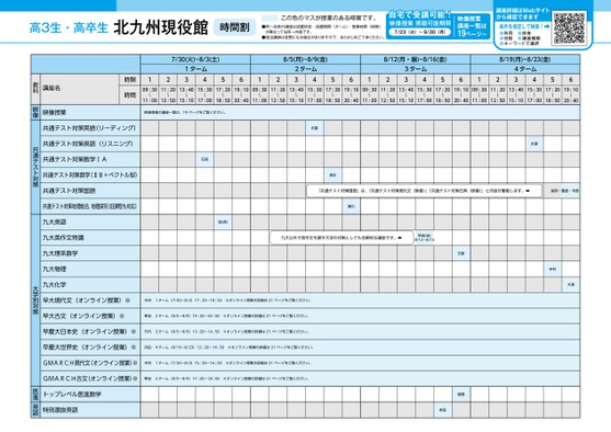 7/30(火)~8/3(土)1ターム341256128/5(月)~8/9(金)2ターム348/12(月・振)~8/16(金)8/19(月)~8/23(金)56123ターム3456124ターム345609:3011:2013:4015:3017:2019:1009:3011:2013:4015:3017:2019:1009:3011:2013:4015:3017:2019:1009:3011:2013:4015:3017:2019:1011:0012:5015:1017:0018:5020:4011:0012:5015:1017:0018:5020:4011:0012:5015:1017:0018:5020:4011:0012:5015:1017:0018:5020:40〜〜〜〜〜〜〜〜〜〜〜〜〜〜〜〜〜〜〜〜〜〜〜〜映像授業の講座一覧は、19ページをご覧ください。時限時間講座名教科映像授業映像共通テスト対策英語(リーディング)共通テスト対策英語(リスニング)共通テスト対策数学ⅠA石原共通テスト対策数学(ⅡB+ベクトル型)共通テスト対策国語共通テスト対策地理総合,地理探究(旧課程も対応)永冨清水永冨「共通テスト対策国語」は、「共通テスト対策現代文(映像)」「共通テスト対策古典(映像)」と内容が重複します。➡莵原・重盛・寺島堤(英)瀬川九大以外で英作文を課す大学の対策としても効果的な講座です。➡早﨑(由)8/12〜8/14石原本村大澤木村1ターム(7/30〜8/3)17:20〜18:50※オンライン授業の詳細は21ページをご覧ください。隼坂2ターム(8/5〜8/9)19:20〜20:50※オンライン授業の詳細は21ページをご覧ください。竹内2ターム(8/5〜8/9)13:20〜14:50※オンライン授業の詳細は21ページをご覧ください。沼田4ターム(8/19〜8/23)13:20〜14:50※オンライン授業の詳細は21ページをご覧ください。木村1ターム(7/30〜8/3)15:20〜16:50※オンライン授業の詳細は21ページをご覧ください。隼坂2ターム(8/5〜8/9)17:20〜18:50※オンライン授業の詳細は21ページをご覧ください。龍頭柴田●2024年度/夏期講習/九州/745/高3・卒生/パターン34402024_56_7_745_11_20240328221526.csv/1ページ校了時削除九大英語九大英作文特講九大理系数学九大物理九大化学早大現代文(オンライン授業)※早大古文(オンライン授業)※早慶大日本史(オンライン授業)※早慶大世界史(オンライン授業)※GMARCH現代文(オンライン授業)※GMARCH古文(オンライン授業)※トップレベル医進数学特別選抜英語共通テスト対策大学別対策医進英語