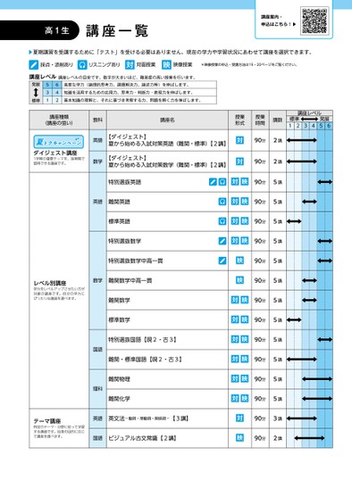 高1生講座一覧講座案内・申込はこちら!▶▶夏期講習を受講するために「テスト」を受ける必要はありません。現在の学力や学習状況にあわせて講座を選択できます。採点・添削ありリスニングあり対対面授業映映像授業*映像授業の申込・受講方法は19・20ページをご覧ください。講座レベル講座レベルの目安です。数字が大きいほど、難易度の高い授業を行います。発展標準531642高度な学力(論理的思考力、課題解決力、論述力等)を伸ばします。知識を活用するための応用力、思考力・判断力・表現力を伸ばします。基本知識の理解と、それに基づき考察する力、問題を解く力を伸ばします。講座レベル発展56標準1234講座種類(講座の狙い)夏トクキャンペーンダイジェスト講座1学期の重要テーマを、短期間で習得できる講座です。教科英語数学講座名【ダイジェスト】夏から始める入試対策英語(難関・標準)【2講】【ダイジェスト】夏から始める入試対策数学(難関・標準)【2講】授業形式授業時間講数対対90分2講90分2講特別選抜英語対映90分5講英語難関英語標準英語特別選抜数学特別選抜数学中高一貫数学難関数学中高一貫難関数学標準数学特別選抜国語【現2・古3】レベル別講座学力をレベルアップさせたい方が対象の講座です。自分の学力にぴったりな講座を選べます。対映90分5講対映90分5講対映90分5講映映90分5講90分5講対映90分5講対映90分5講対映90分5講難関・標準国語【現2・古3】対映90分5講対映90分5講対映90分5講対映90分3講90分2講国語理科難関物理難関化学テーマ講座特定のテーマ・分野に絞って学習する講座です。自身の目的に応じて講座を選べます。英語英文法-動詞・準動詞・関係詞-【3講】国語ビジュアル古文常識【2講】