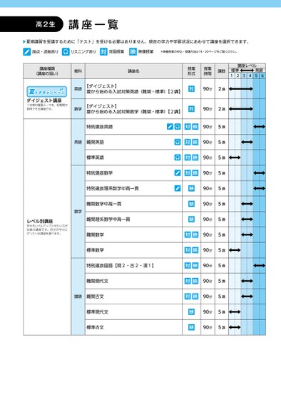 高2生講座一覧▶夏期講習を受講するために「テスト」を受ける必要はありません。現在の学力や学習状況にあわせて講座を選択できます。採点・添削ありリスニングあり対対面授業映映像授業*映像授業の申込・受講方法は19・20ページをご覧ください。講座レベル発展56標準1234講座種類(講座の狙い)夏トクキャンペーンダイジェスト講座1学期の重要テーマを、短期間で習得できる講座です。教科英語数学講座名【ダイジェスト】夏から始める入試対策英語(難関・標準)【2講】【ダイジェスト】夏から始める入試対策数学(難関・標準)【2講】授業形式授業時間講数対対90分2講90分2講特別選抜英語対映90分5講英語難関英語標準英語特別選抜数学特別選抜理系数学中高一貫難関数学中高一貫数学難関理系数学中高一貫難関数学標準数学レベル別講座学力をレベルアップさせたい方が対象の講座です。自分の学力にぴったりな講座を選べます。対映90分5講対映90分5講対映90分5講映映映90分5講90分5講90分5講対映90分5講対映90分5講特別選抜国語【現2・古2・漢1】対映90分5講難関現代文国語難関古文標準現代文標準古文対映90分5講対映90分5講映映90分5講90分5講