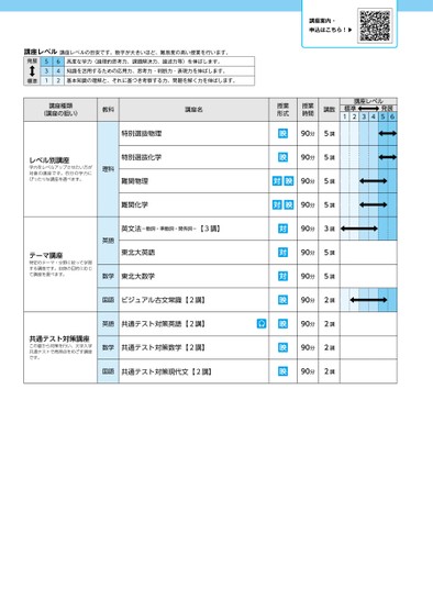 講座案内・申込はこちら!▶講座レベル発展56標準1234講座レベル講座レベルの目安です。数字が大きいほど、難易度の高い授業を行います。発展標準531642高度な学力(論理的思考力、課題解決力、論述力等)を伸ばします。知識を活用するための応用力、思考力・判断力・表現力を伸ばします。基本知識の理解と、それに基づき考察する力、問題を解く力を伸ばします。講座種類(講座の狙い)教科講座名レベル別講座学力をレベルアップさせたい方が対象の講座です。自分の学力にぴったりな講座を選べます。理科特別選抜物理特別選抜化学難関物理難関化学英文法-動詞・準動詞・関係詞-【3講】テーマ講座特定のテーマ・分野に絞って学習する講座です。自身の目的に応じて講座を選べます。英語東北大英語数学東北大数学共通テスト対策講座この夏から対策を行い、大学入学共通テストで高得点をめざす講座です。国語ビジュアル古文常識【2講】英語共通テスト対策英語【2講】数学共通テスト対策数学【2講】国語共通テスト対策現代文【2講】授業形式授業時間講数映映90分5講90分5講対映90分5講対映90分5講対対対映映映映90分3講90分5講90分5講90分2講90分2講90分2講90分2講